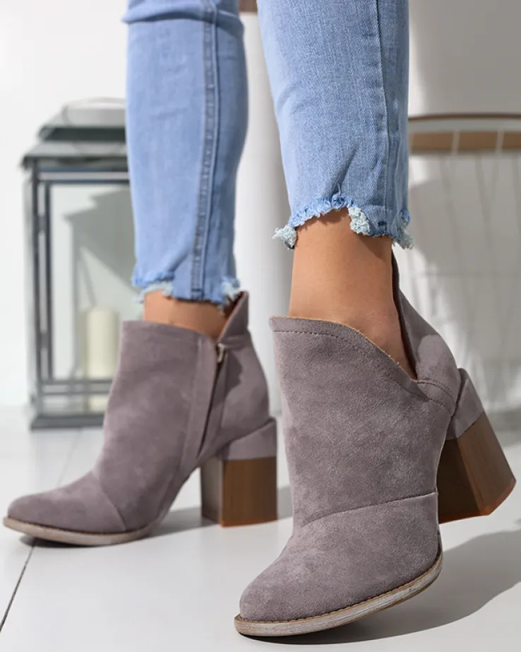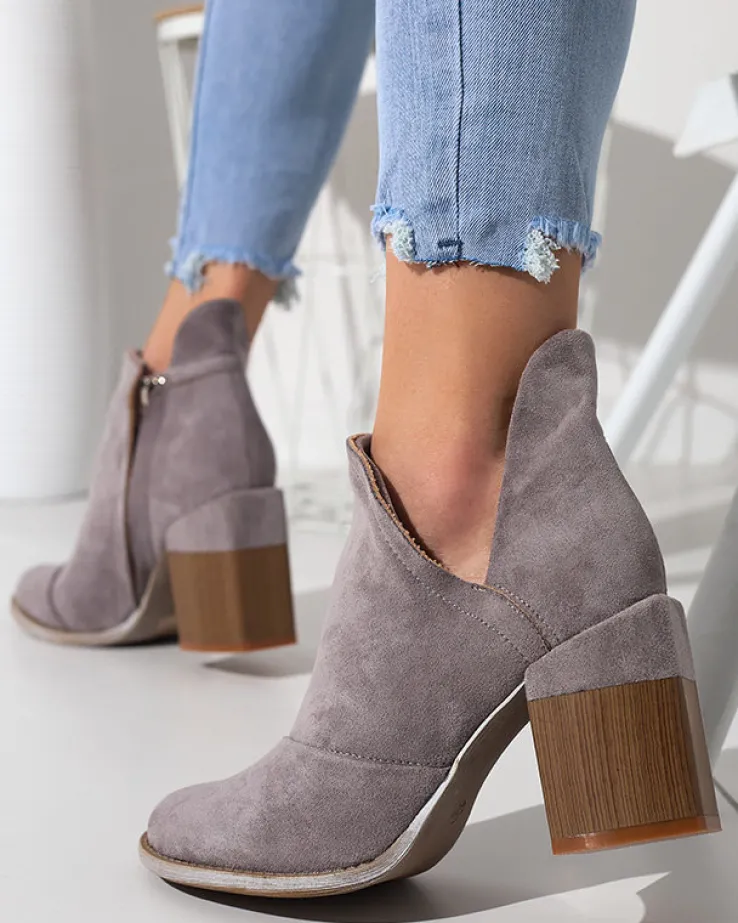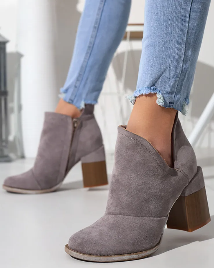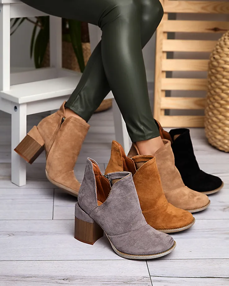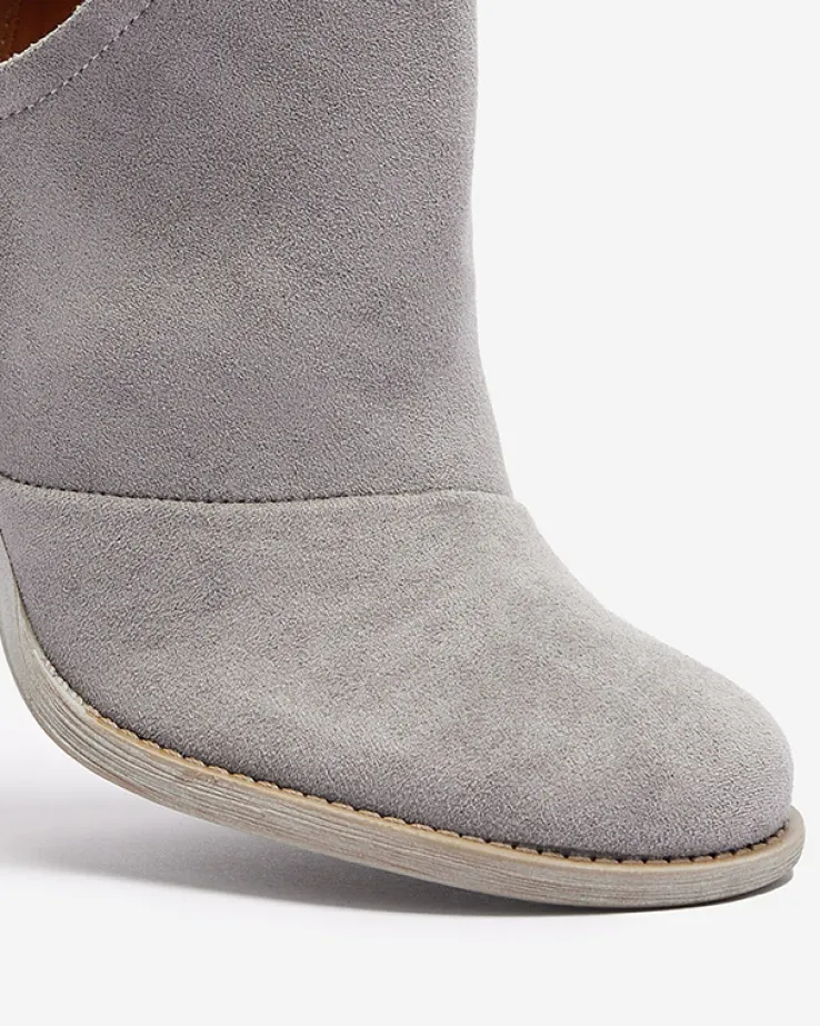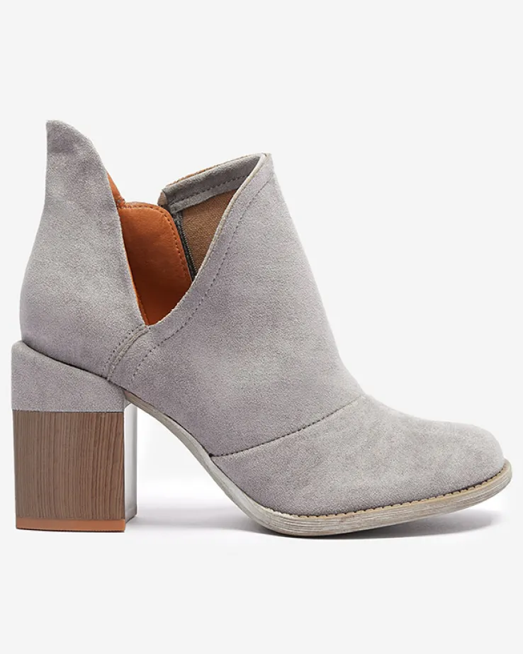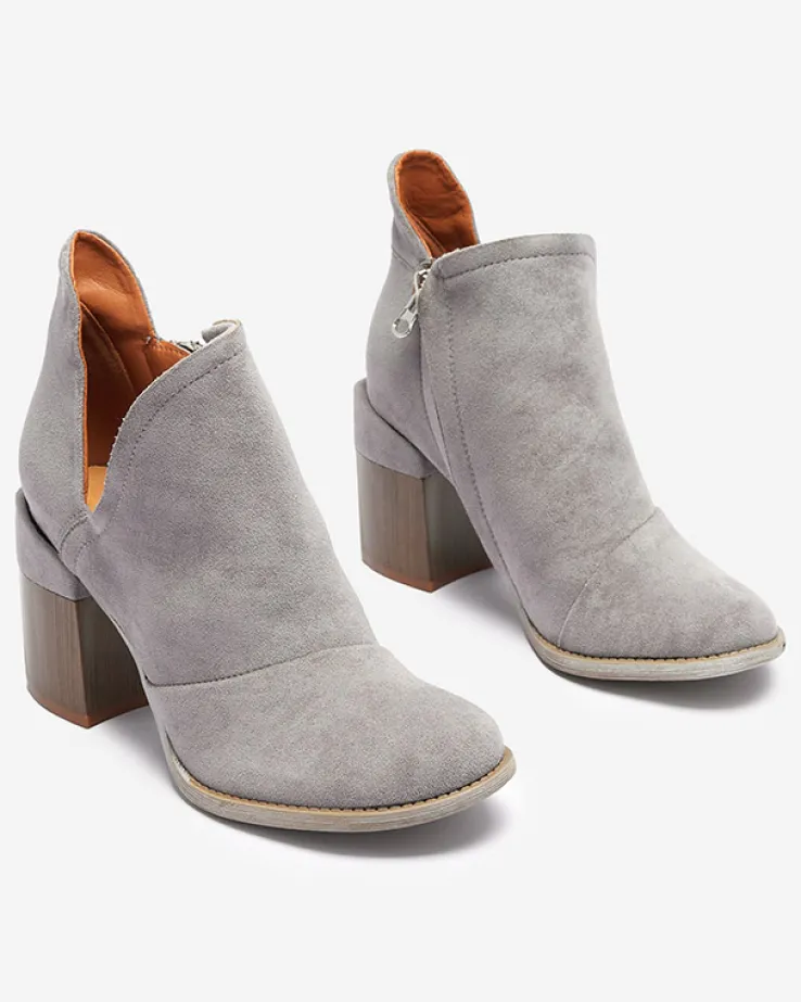 - Oryginalne damskie botki na słupku z okrągłym noskiem. Materiał wykonania to eko-skóra zamszowa, w środku eko-skórzana wkładka. Cholewka zapinana suwakiem, po boku posiada wycięcia. Idealny dodatek do jesiennych stylizacji.