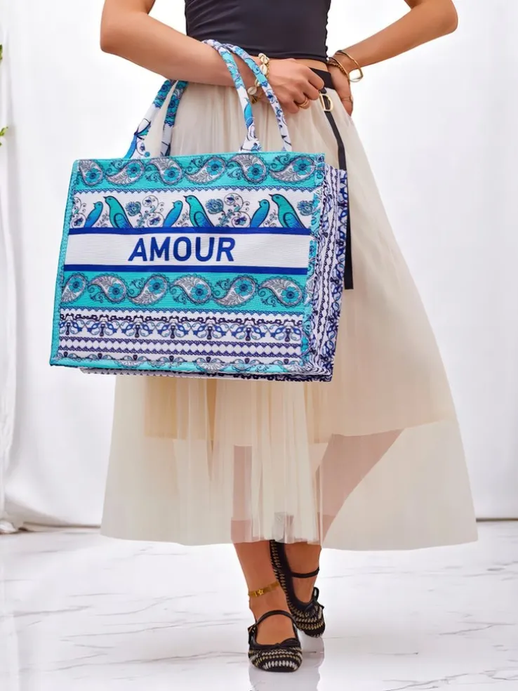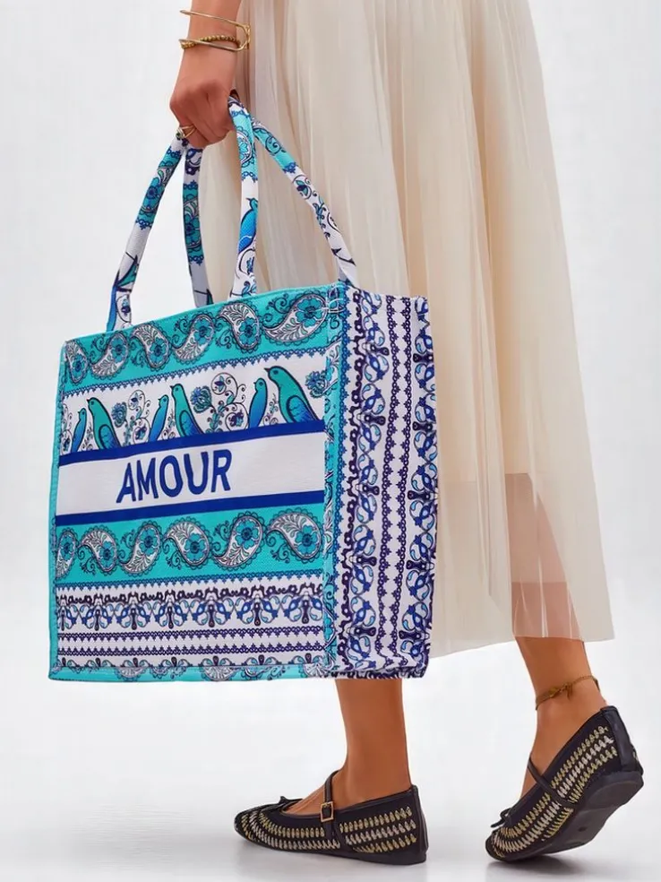 - Duża, materiałowa torebka damska z wzorzystym motywem i napisem AMOUR. 1 komora, zamek. Lekka, pojemna i stylowa – idealna na co dzień i letnie wyjścia!