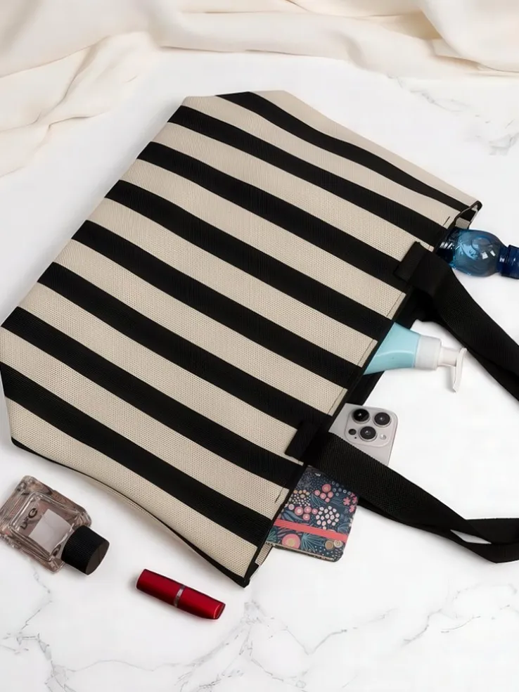 - Duża, materiałowa torebka damska z klasycznym wzorem w paski. 1 komora, zapięcie na zamek. Lekka, pojemna i stylowa – idealna na zakupy i codzienne wyjścia!