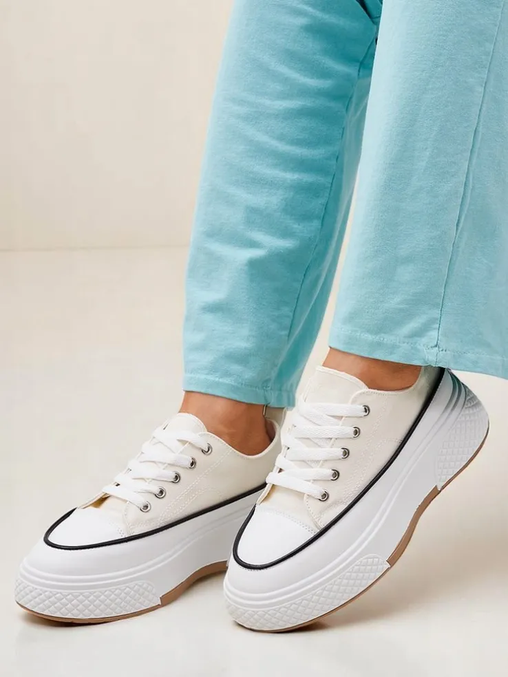 - Stylowe trampki damskie wykonane z materiału tkaninowego. Model na wygodnej platformie. Cholewka jest sznurowana. Świetne do tworzenia casualowych outfitów!