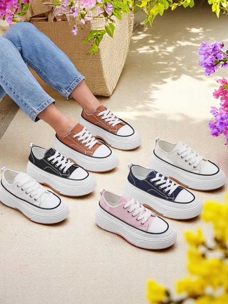 - Stylowe trampki damskie wykonane z materiału tkaninowego. Model na wygodnej platformie. Cholewka jest sznurowana. Świetne do tworzenia casualowych outfitów!