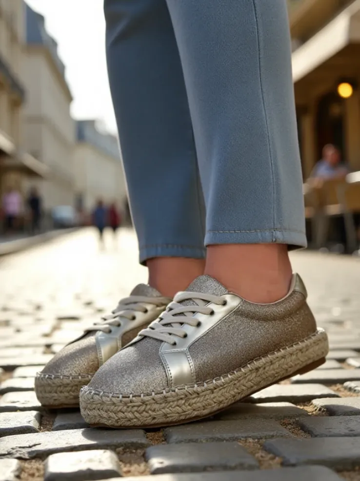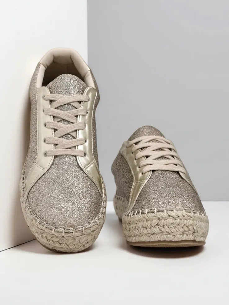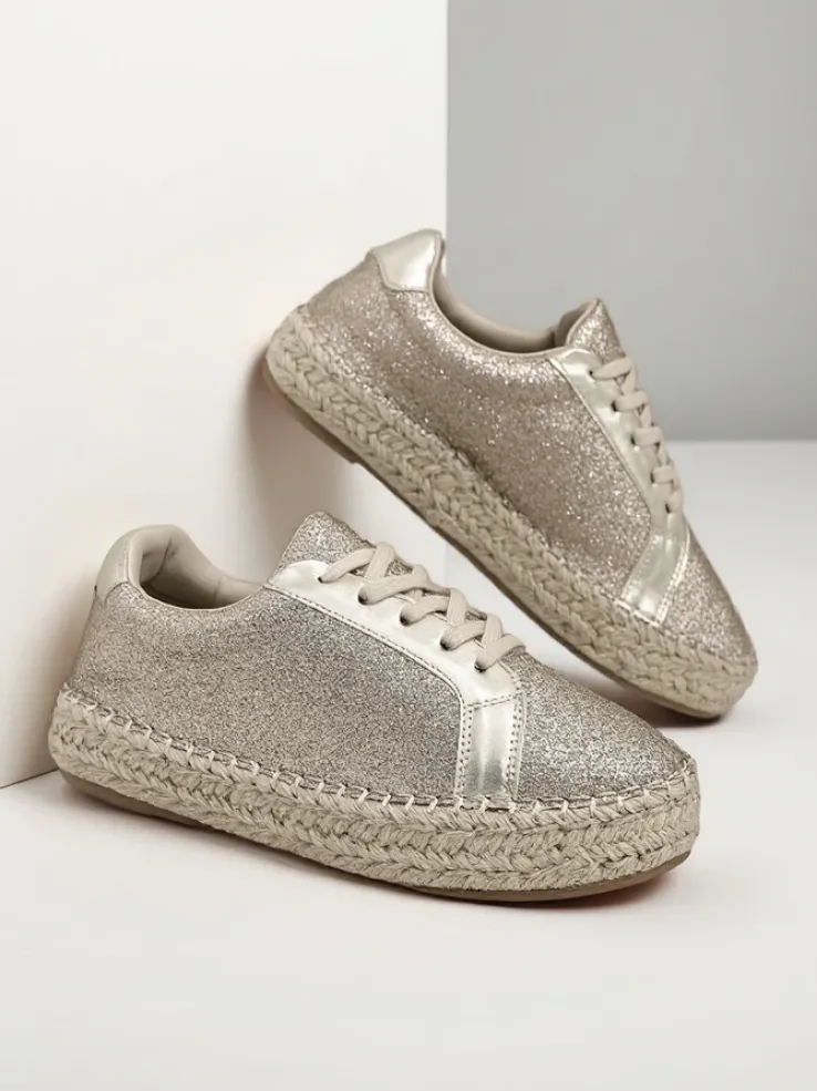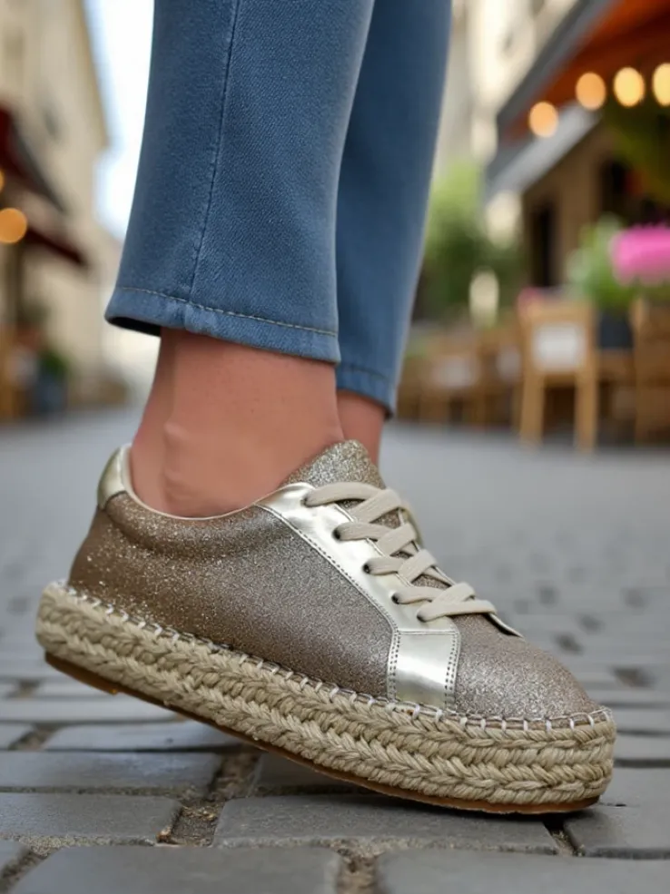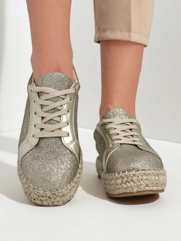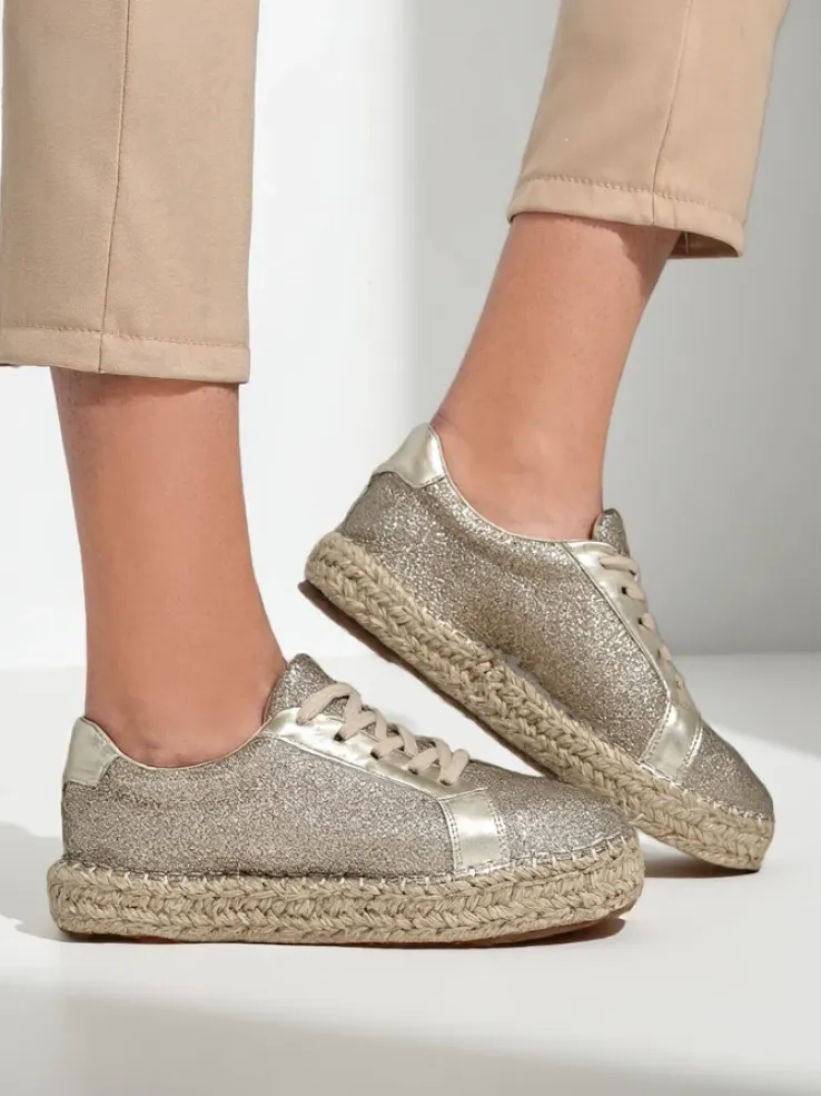 - Damskie trampki wykonane z materiału tkaninowego z brokatem. Cholewka sznurowana. Podeszwa klasycznie gumowa opleciona sznurkiem jutowym. Te buty będą świetne na co dzień!