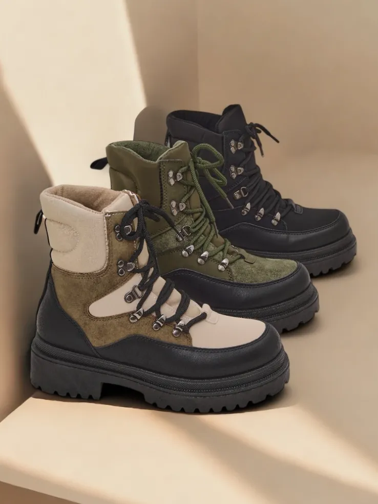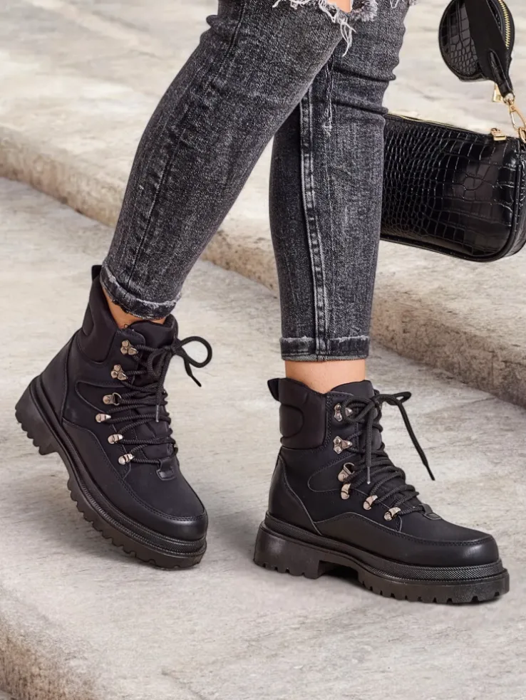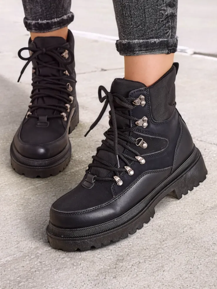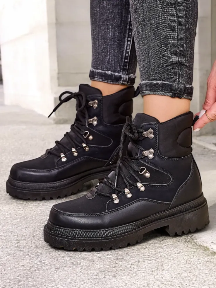 - Wyjątkowe trapery damskie, wykonane z połączenia eko skóry, eko skóry matowej i tkaniny. Model posiada sznurowaną cholewkę. Od środka wypełniony grubszą pianką i tkaniną. Konkretne buty na złą pogodę!
