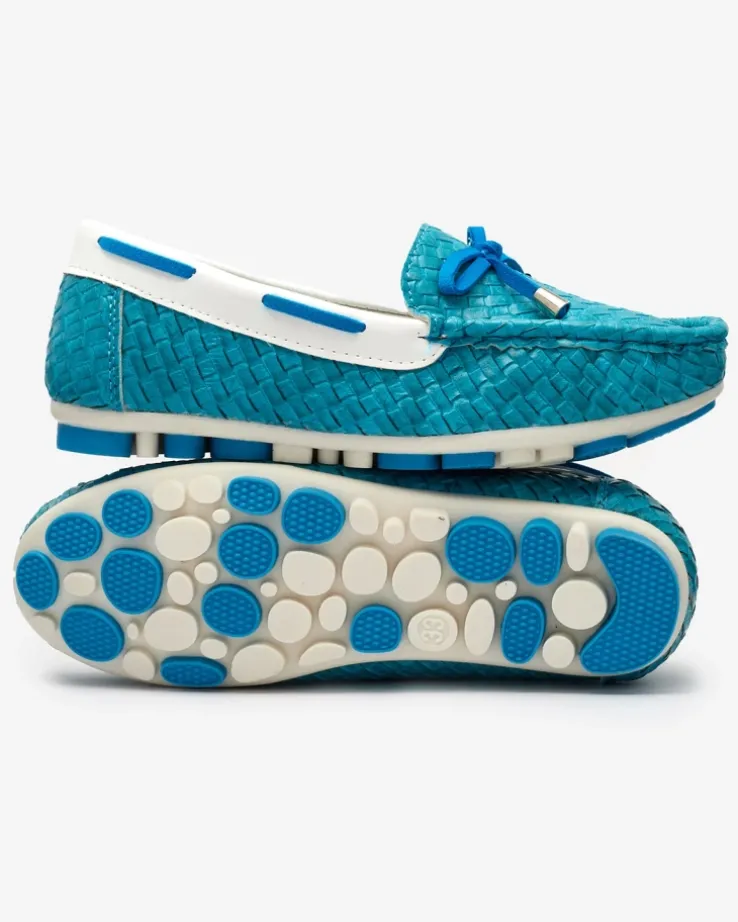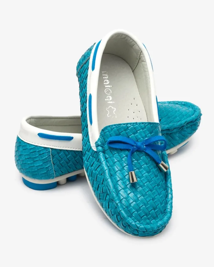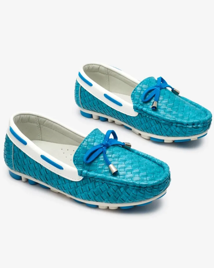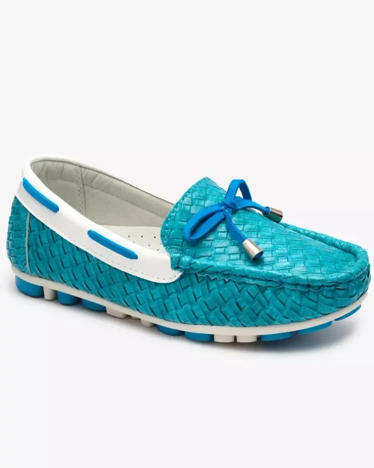 - Wyjątkowe dziecięce mokasyny wykonane ze skóry ekologicznej. Cholewka posiada wykończenie we wzór a’la plecionka. Wkładka wyłożona skórą naturalną. Idealnie obuwie na wiosnę! Uwaga: produkt posiada przebarwienia na materiale.