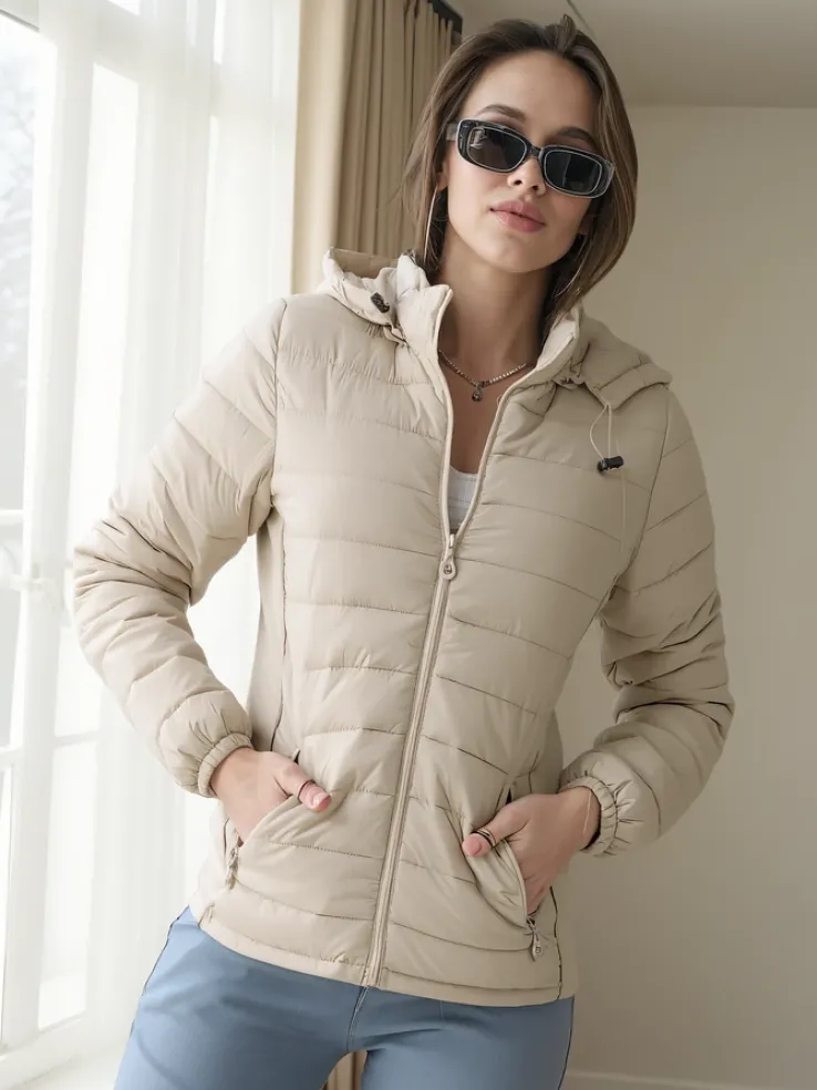 - Lekka damska kurtka przejściowa z odpinanym kapturem, zapinana na zamek błyskawiczny. Model z 2 kieszeniami i ściągaczami po bokach. UWAGA: Dokładność pomiaru (+/-) 1 cm.