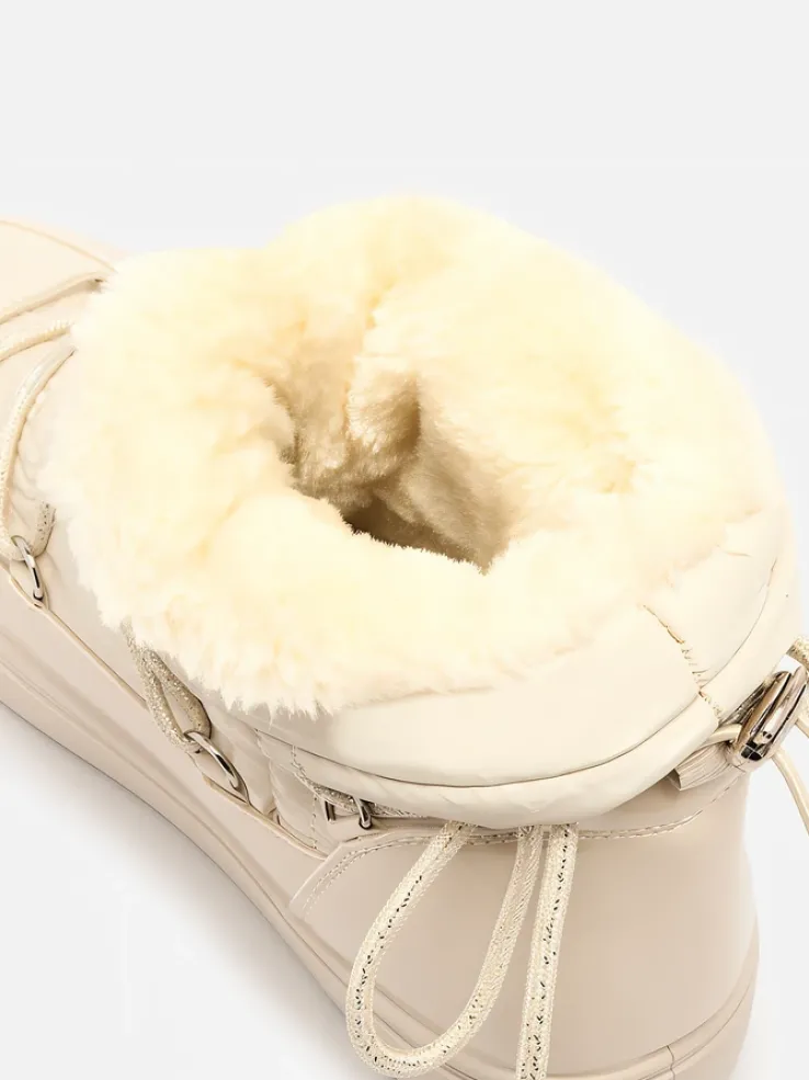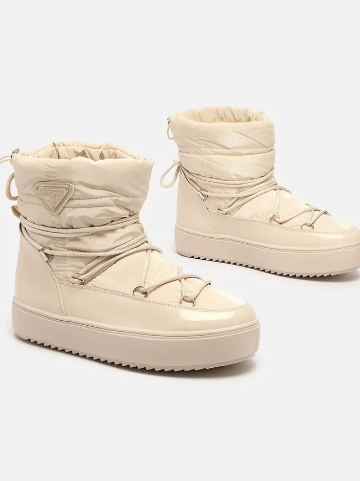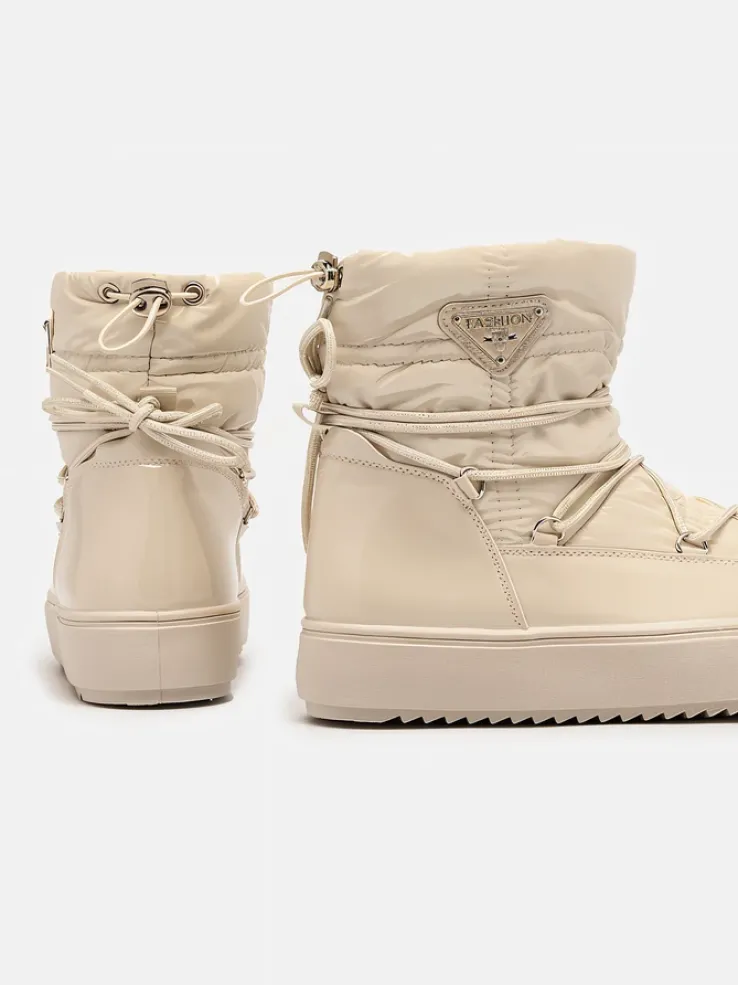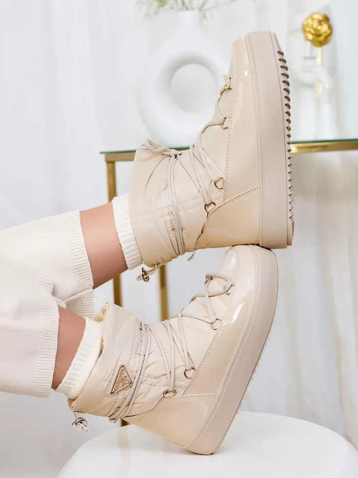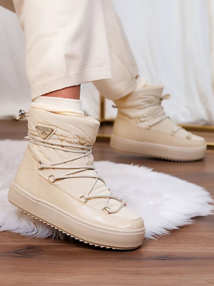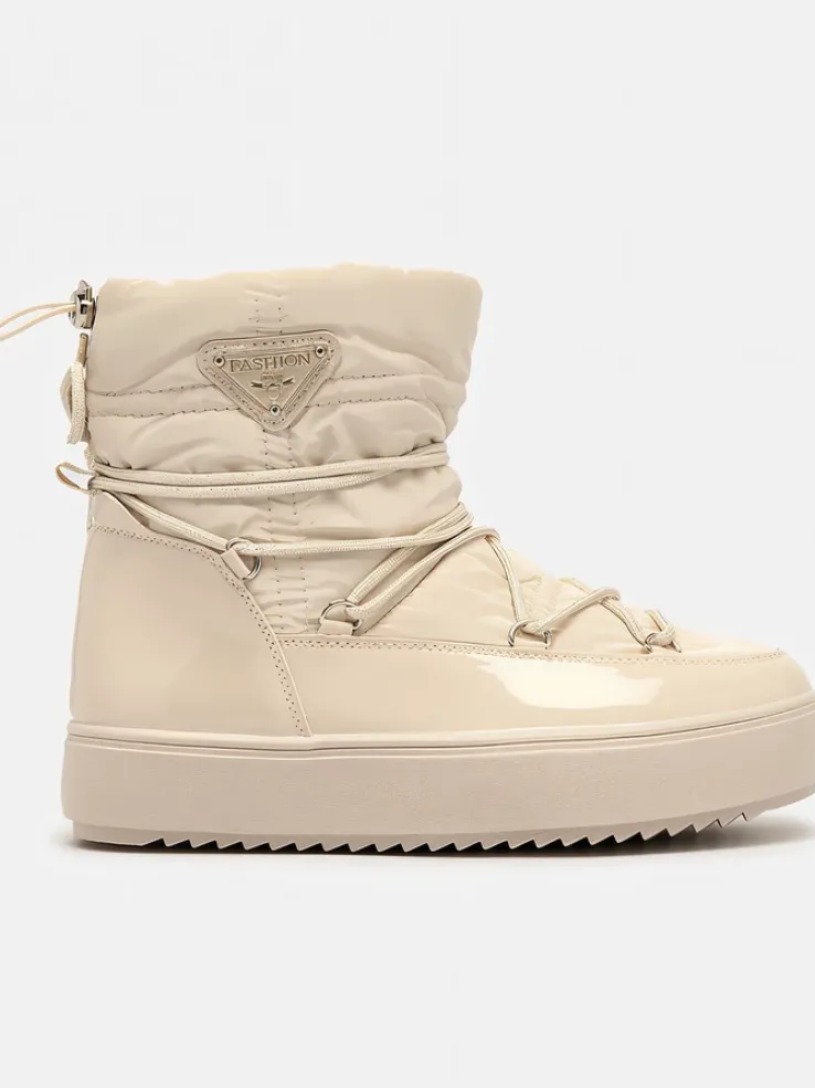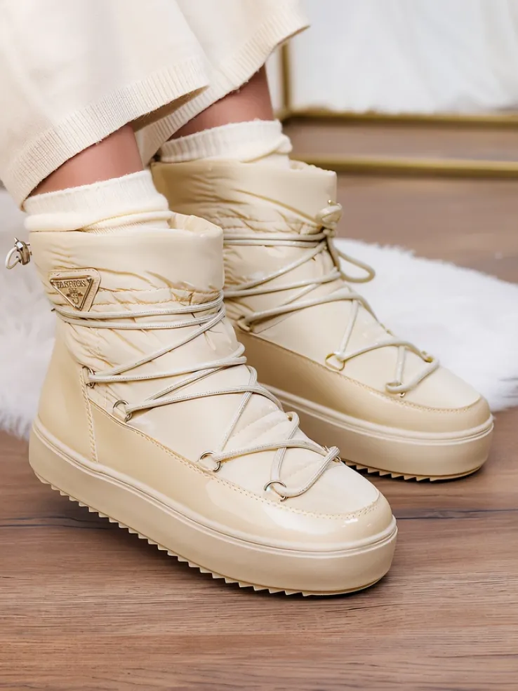 - Damskie obuwie typu śniegowce z cholewką wykonaną z połączenia eko skóry lakierowanej oraz materiału a’la cerata. W środku ocieplenie w formie futerka, obuwie wsuwane. Model posiada ściągacz na końcu cholewki. Idealne na zimę!