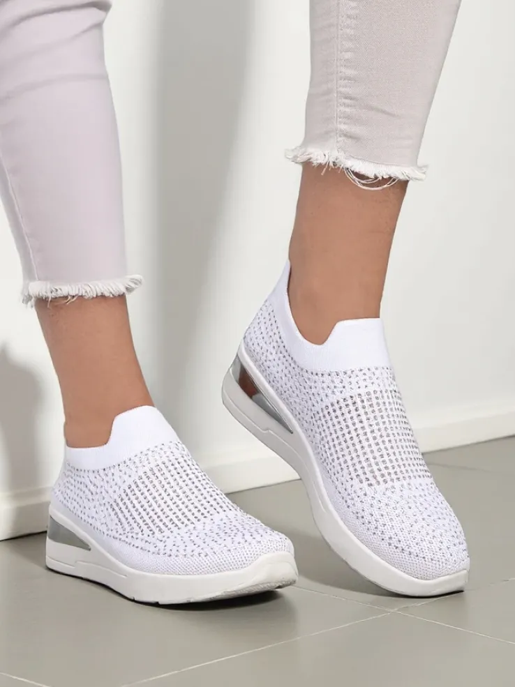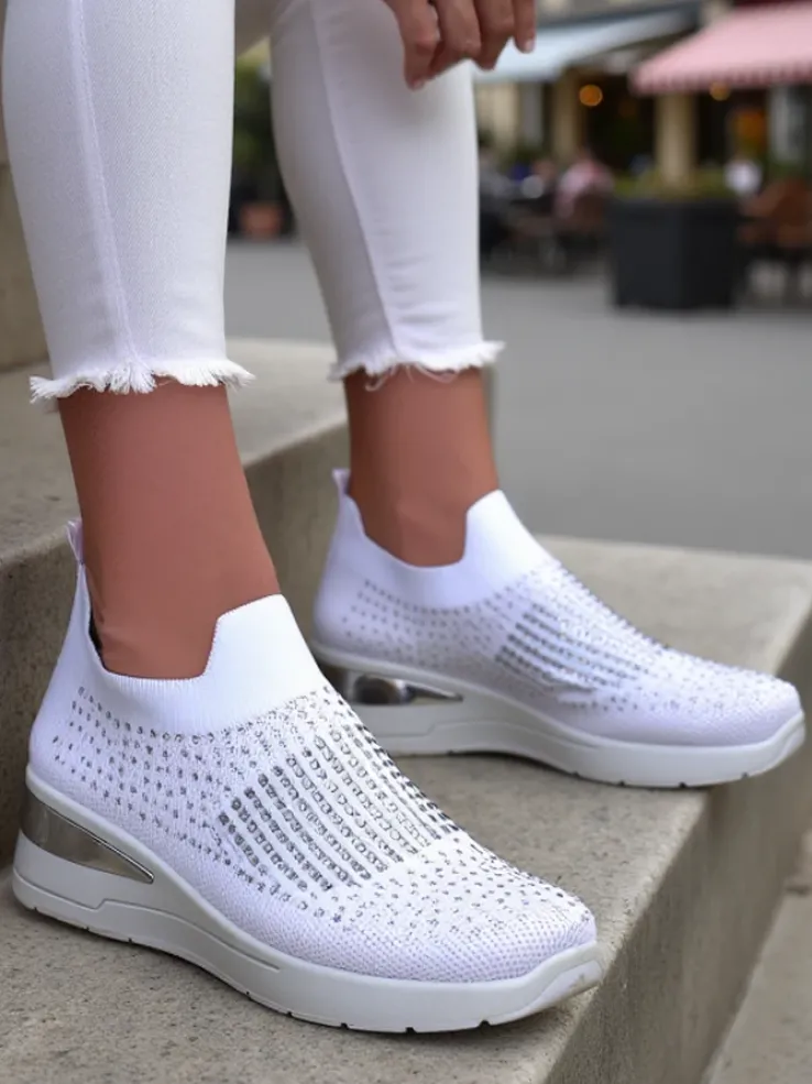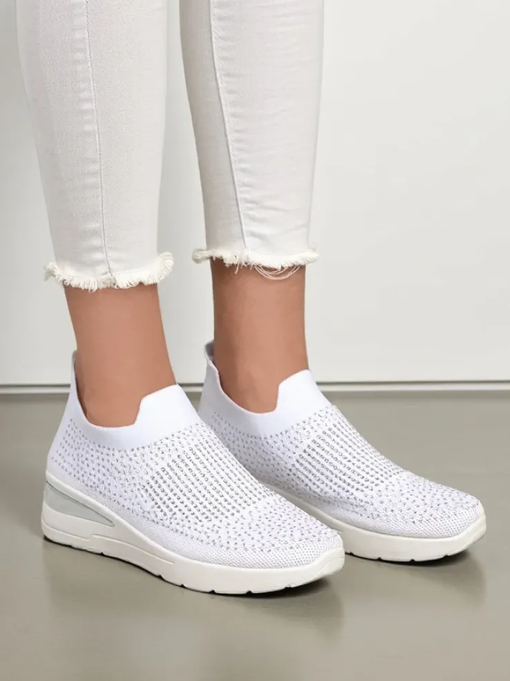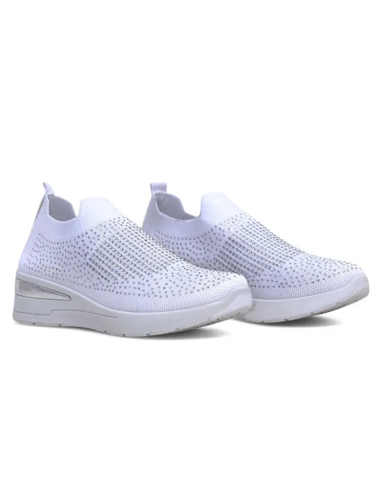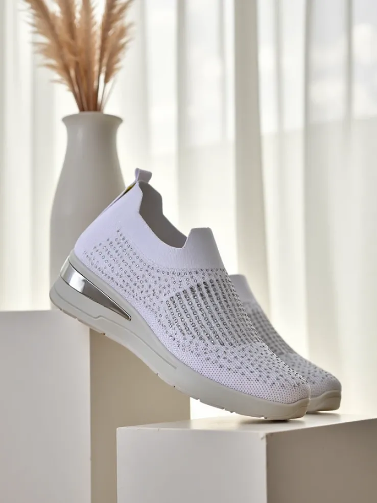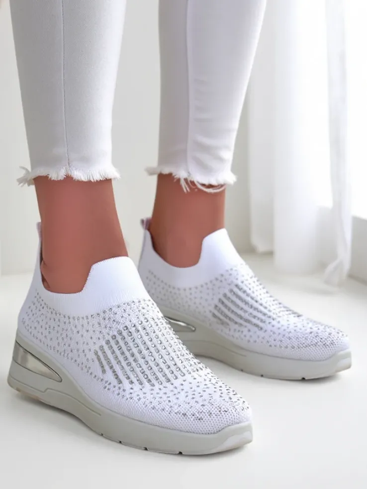 - Modne sneakersy damskie na koturnie, wykonane z tkaniny zdobionej cyrkoniami. W środku miękka, tkaninowa wkładka. Obuwie wsuwane. Będą świetną ozdobą do codziennych stylizacji.