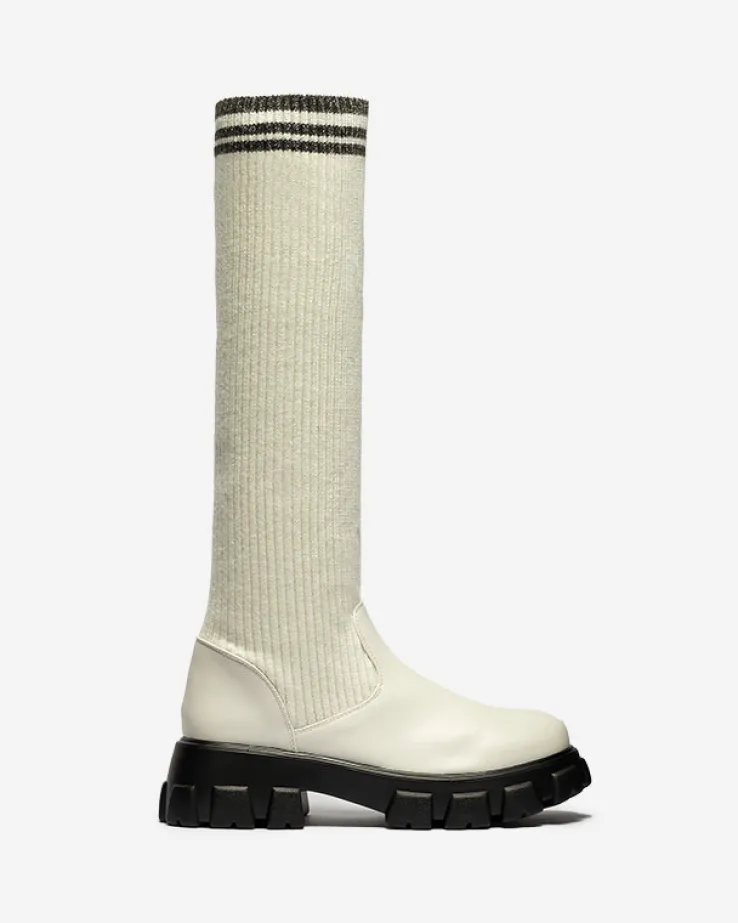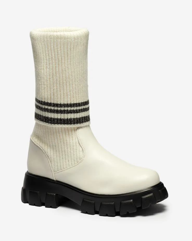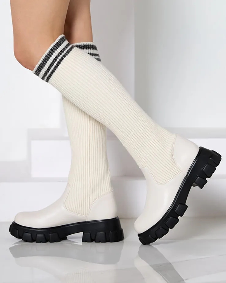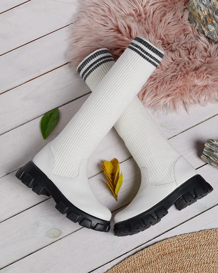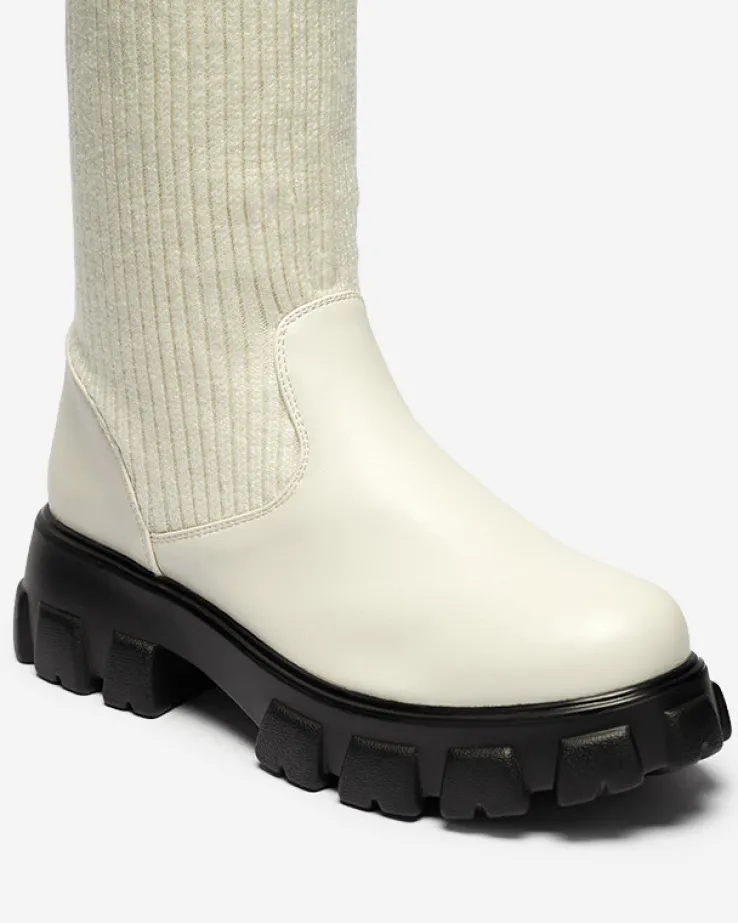 - Wsuwane kozaki damskie wykonane z połączenia skóry ekologicznej i tkaniny. Buty na grubszej podeszwie, z okrągłym noskiem i elastyczną cholewką. Będą idealnym dodatkiem do płaszcza! ECRU BUTY DAMSKIE KOZAKI NIEOCIEPLANE ALERPI