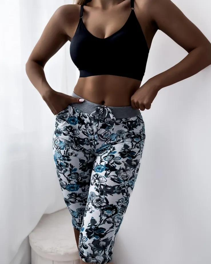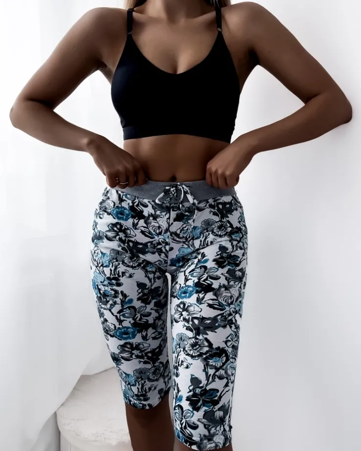 - Wygodne damskie spodenki z kieszeniami, wykonane z tkaniny bawełnianej w kwiaty. Model o długości 3/4, posiada gumę oraz wiązane toczki w pasie. UWAGA: Dokładność pomiaru (+/-) 1 cm.
