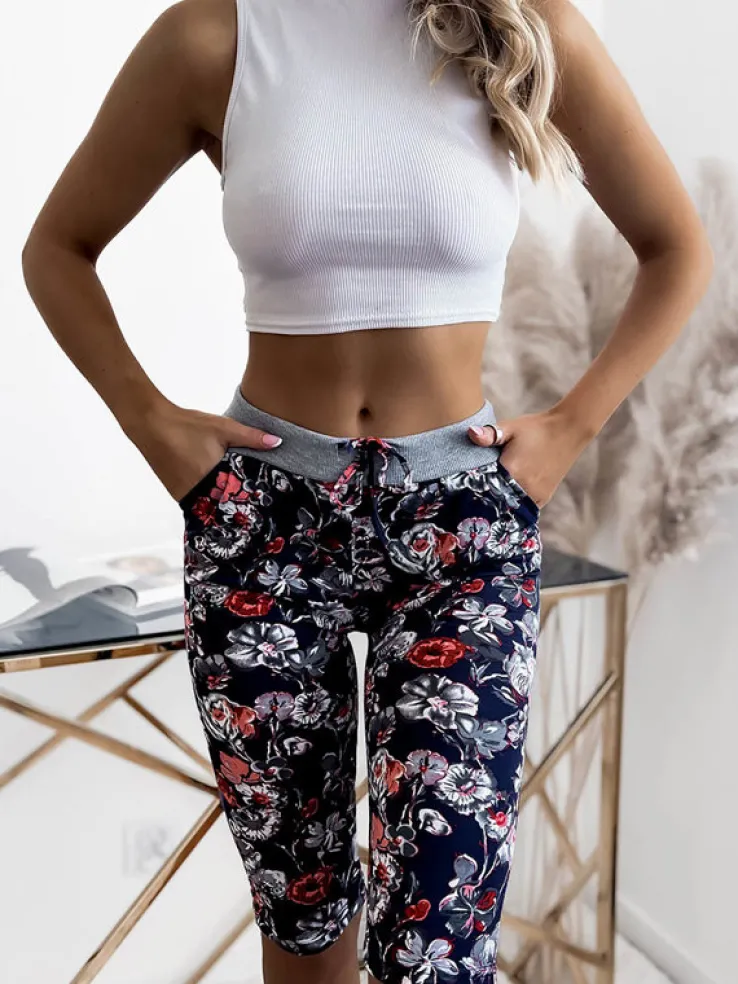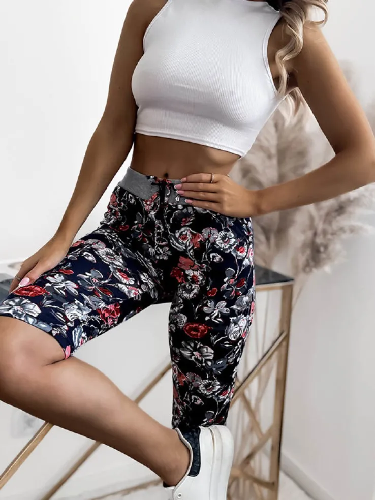 - Wygodne damskie spodenki z kieszeniami, wykonane z tkaniny bawełnianej w kwiaty. Model o długości 3/4, posiada gumę oraz wiązane toczki w pasie. UWAGA: Dokładność pomiaru (+/-) 1 cm.