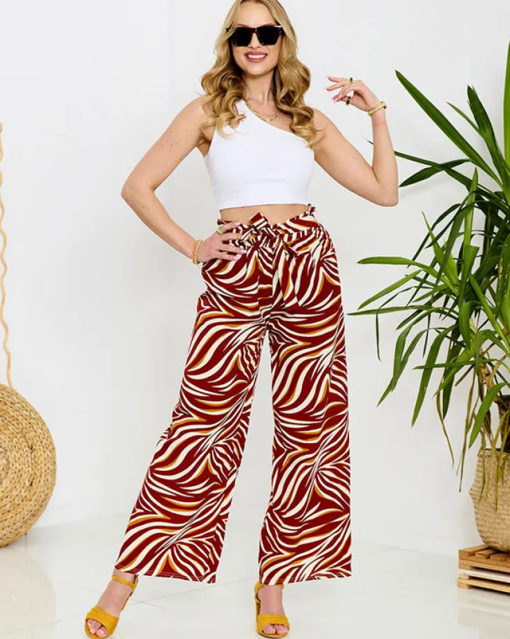 - Wzorzyste szerokie spodnie damskie. Model wykonany z lekkiej i zwiewnej tkaniny, posiada gumę oraz wiązanie podkreślające talię. Idealna baza do stylowych outfitów na wiosnę! UWAGA: Dokładność pomiaru (+/-) 1 cm.