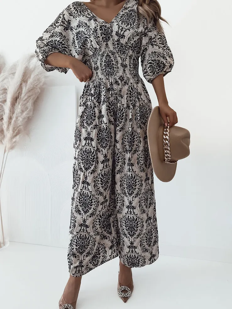 - Wzorzysty kombinezon damski z krótkimi rękawami. Model z dekoltem V oraz gumą w talii. Produkt posiada szerokie, długie nogawki.