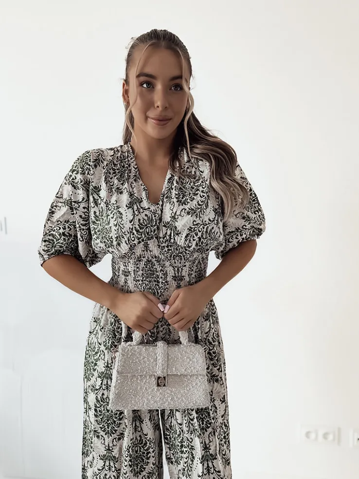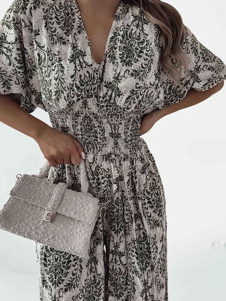 - Wzorzysty kombinezon damski z krótkimi rękawami. Model z dekoltem V oraz gumą w talii. Produkt posiada szerokie, długie nogawki.