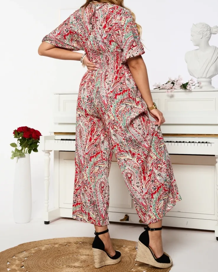 - Wzorzysty kombinezon damski z krótkimi rękawami. Model z kopertowym dekoltem, wiązaniem z tyłu oraz szeroką gumą w talii. Produkt posiada szerokie, długie nogawki. UWAGA: Dokładność pomiaru (+/-) 1 cm.