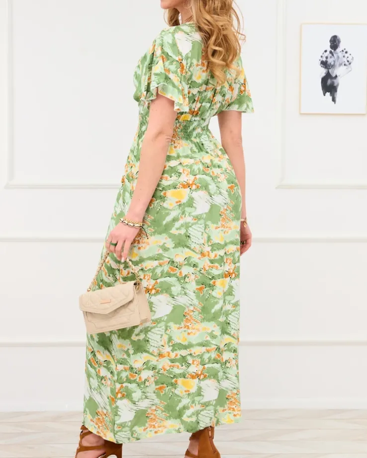 - Modna damska sukienka o długości midi, wykonana z miękkiej tkaniny z ciekawym wzorem. Model z kopertowym dekoltem, posiada krótkie rękawy i szeroką gumę podkreślającą talię. Doskonała na co dzień! UWAGA: Dokładność pomiaru (+/-) 1 cm.