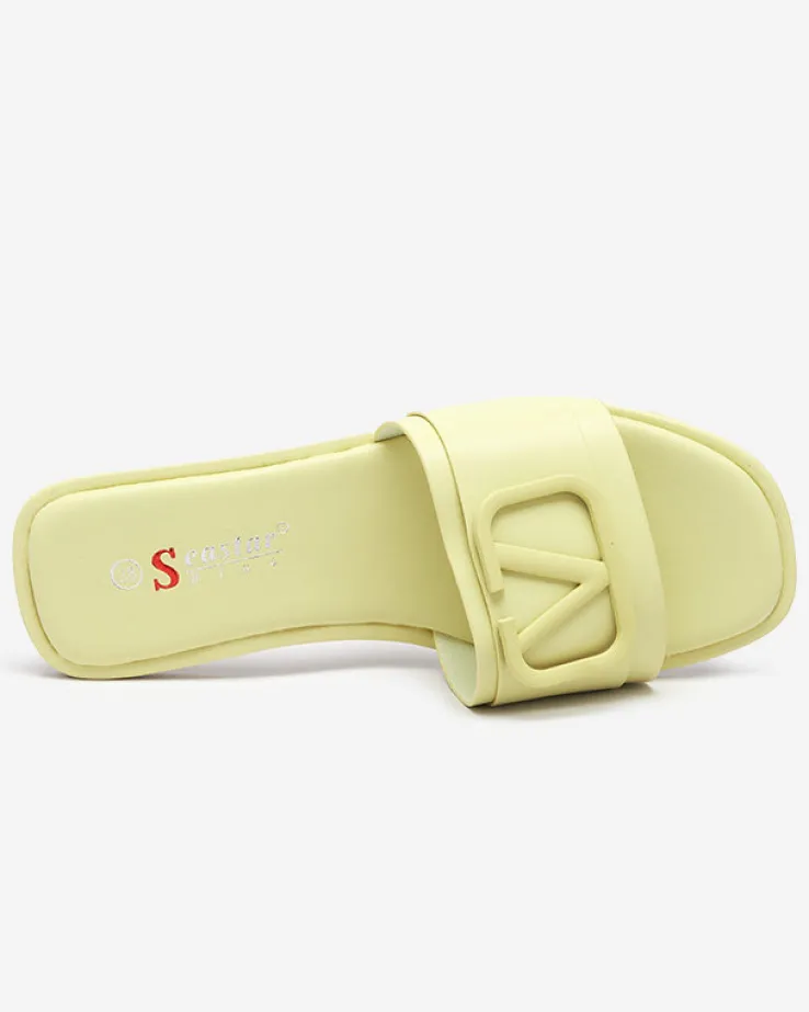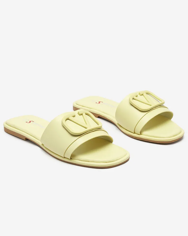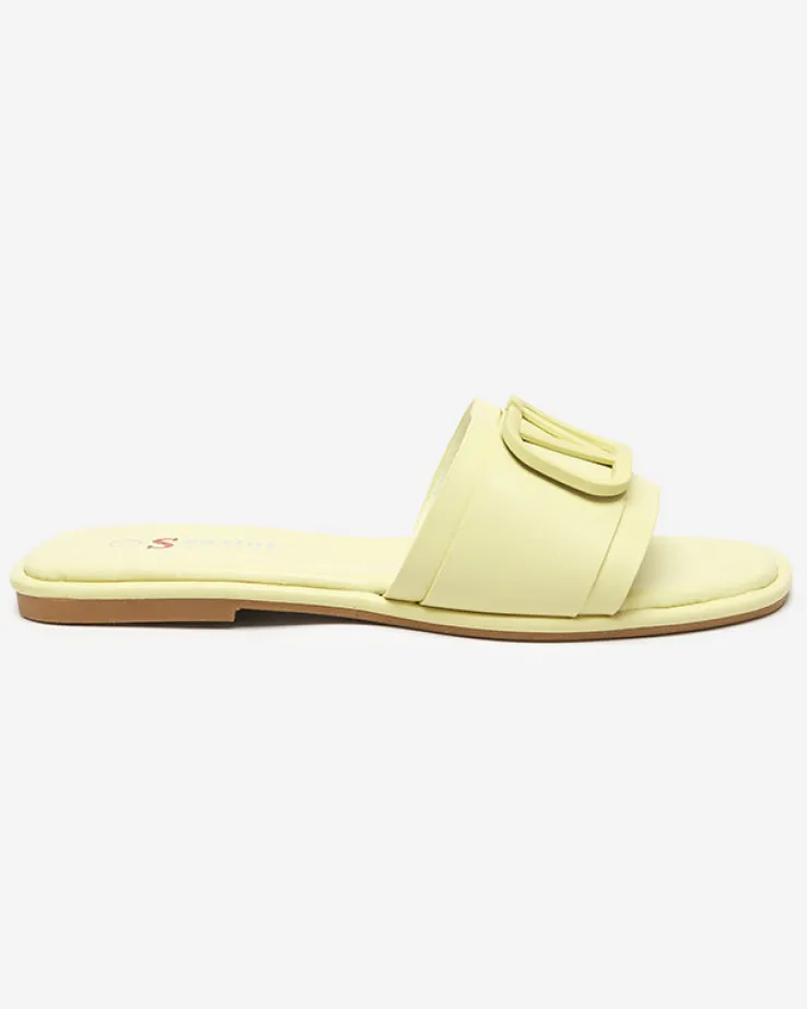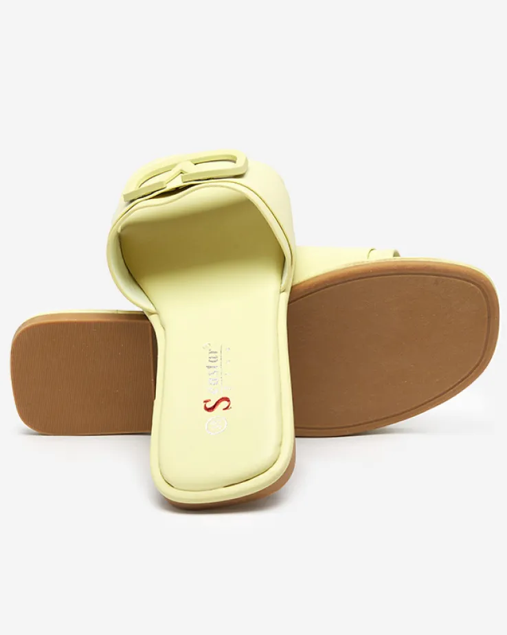- Stylowe damskie klapki na płaskim obcasie, para wykonana z eko skóry. Cholewkę zdobi klamerka w kolorze obuwia. Super dodatek do Twoich casualowych outfitów! UWAGA: model może posiadać delikatne pęknięcia na wkładce.