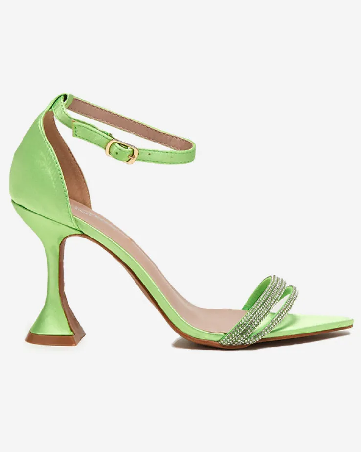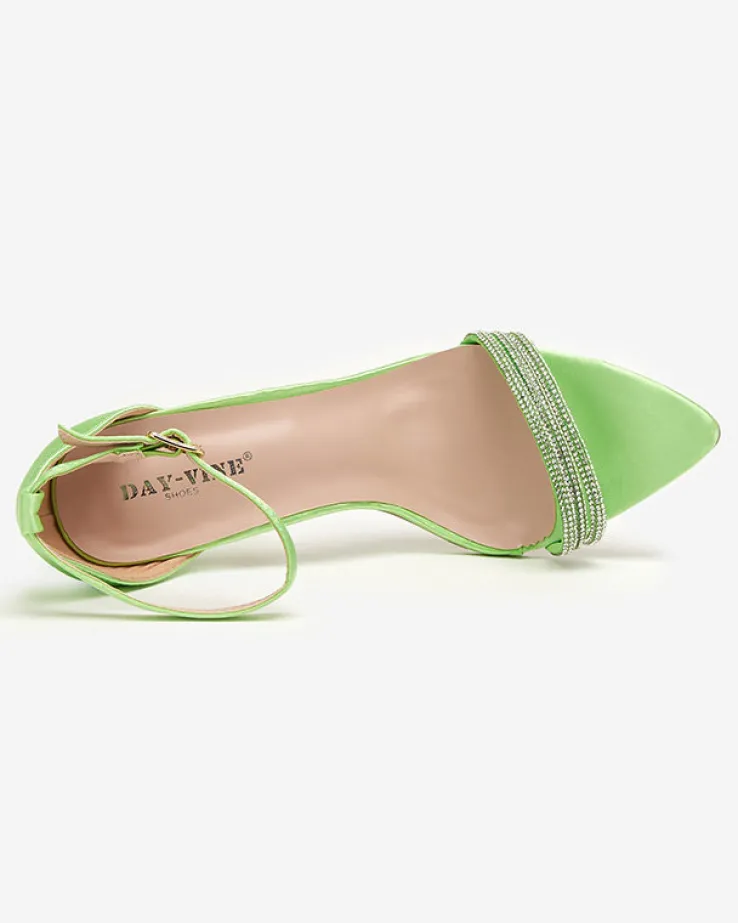 - Niespotykane damskie sandałki na szeroko zakończonej szpilce, wykonane z materiału tkaninowego z eko-skórzaną wkładką. Model z paseczkiem zapinanym na sprzączkę. UWAGA: produkt może posiadać śladowe ilości kleju na materiale.