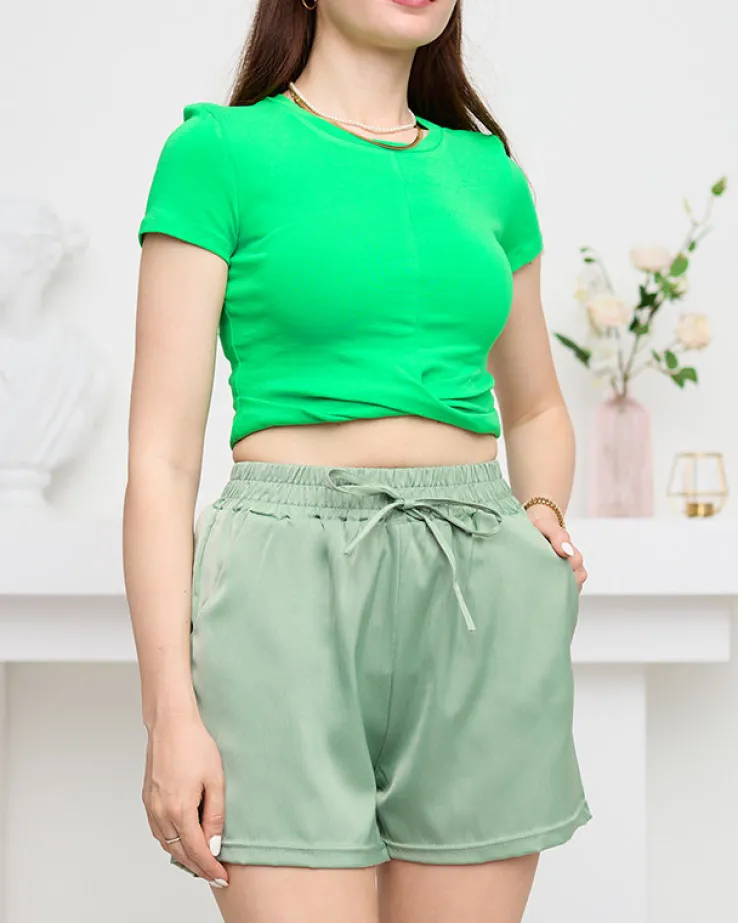 - Eleganckie damskie krótkie spodenki wykonane z satynowej tkaniny bawełnianej. Model posiada dwie kieszenie, szeroką gumę w pasie i ozdobne wiązane troczki. Idealne dopełnienie eleganckich, letnich stylizacji! UWAGA: Dokładność pomiaru (+/-) 1 cm.