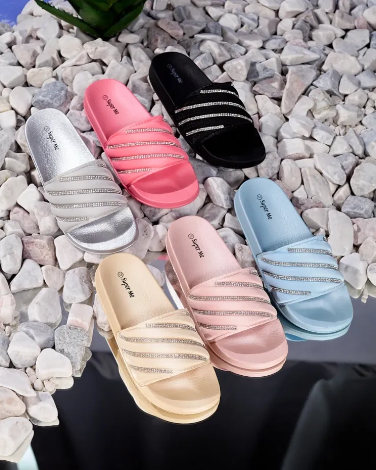 - Prześliczne damskie klapki na płaskiej podeszwie, zdobione drobnymi cyrkoniami, wkładka wykonana z tworzywa gumowego. Ta piękna para musi znaleźć się w Twojej walizce podczas urlopu!