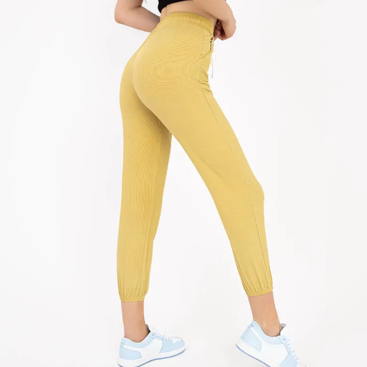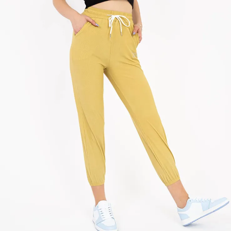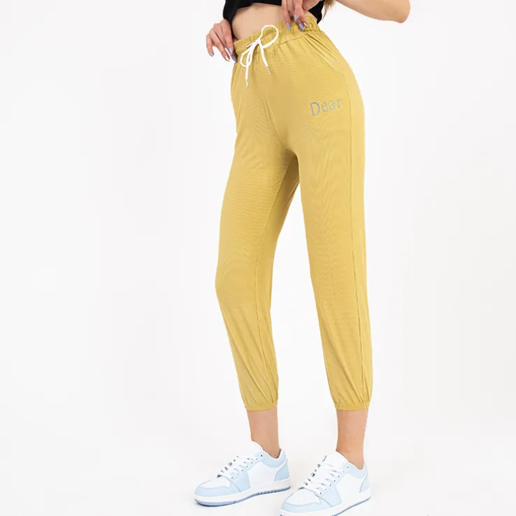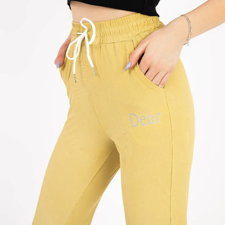 - Damskie spodnie materiałowe z napisem, materiał wykonania to przewiewna tkanina. Spodnie posiadają szeroką gumkę w pasie utrzymującą je we właściwym miejscu oraz na nogawkach. Dodatkowo wiązanie w pasie. UWAGA: Dokładność pomiaru (+/-) 1 cm.
