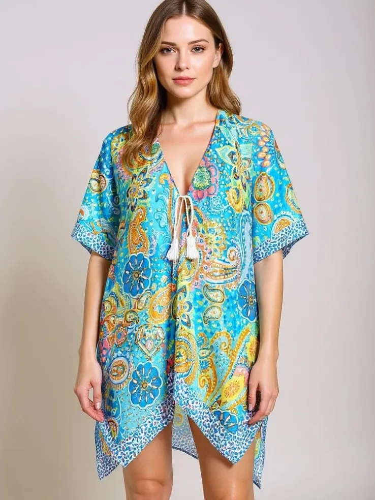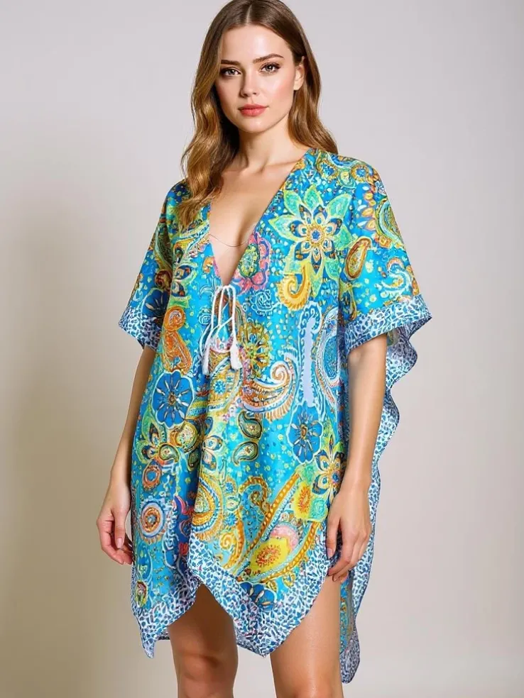 Sukienka Pareo Aurora Riviera – kolorowa tkanina Royalfashion, dekolt V