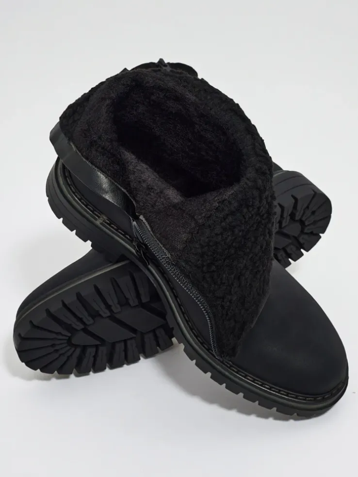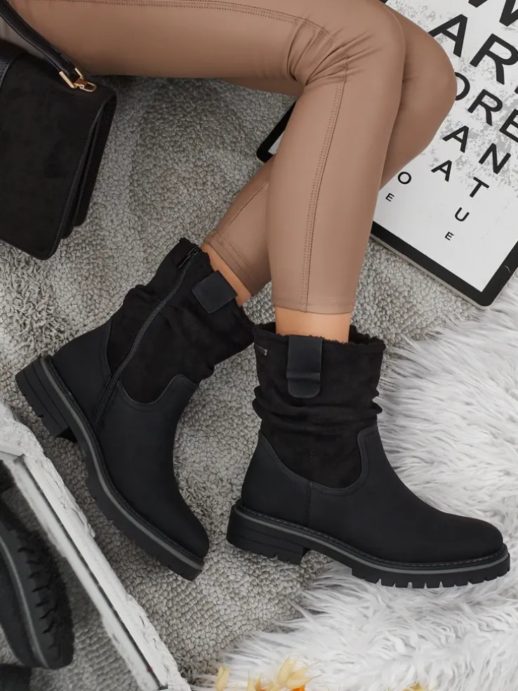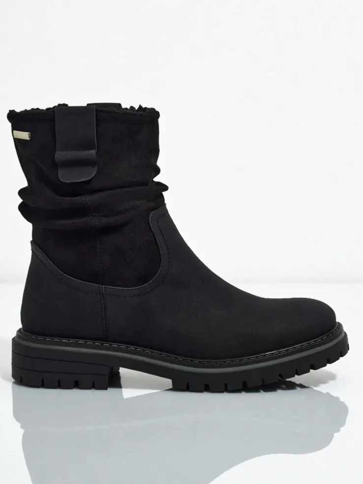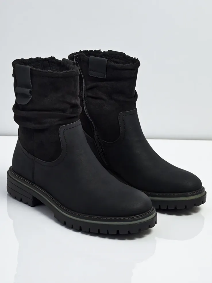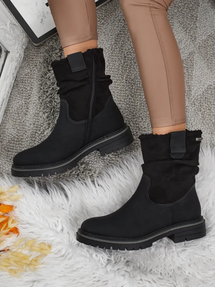 - Damskie botki zapinane na zamek. Model wykonany ze skóry ekologicznej zamszowej, na płaskiej podeszwie. Posiada ocieplenie a’la futerko. Zdobione lekko marszczoną cholewką. Wygodny i stylowy, idealny na jesień!