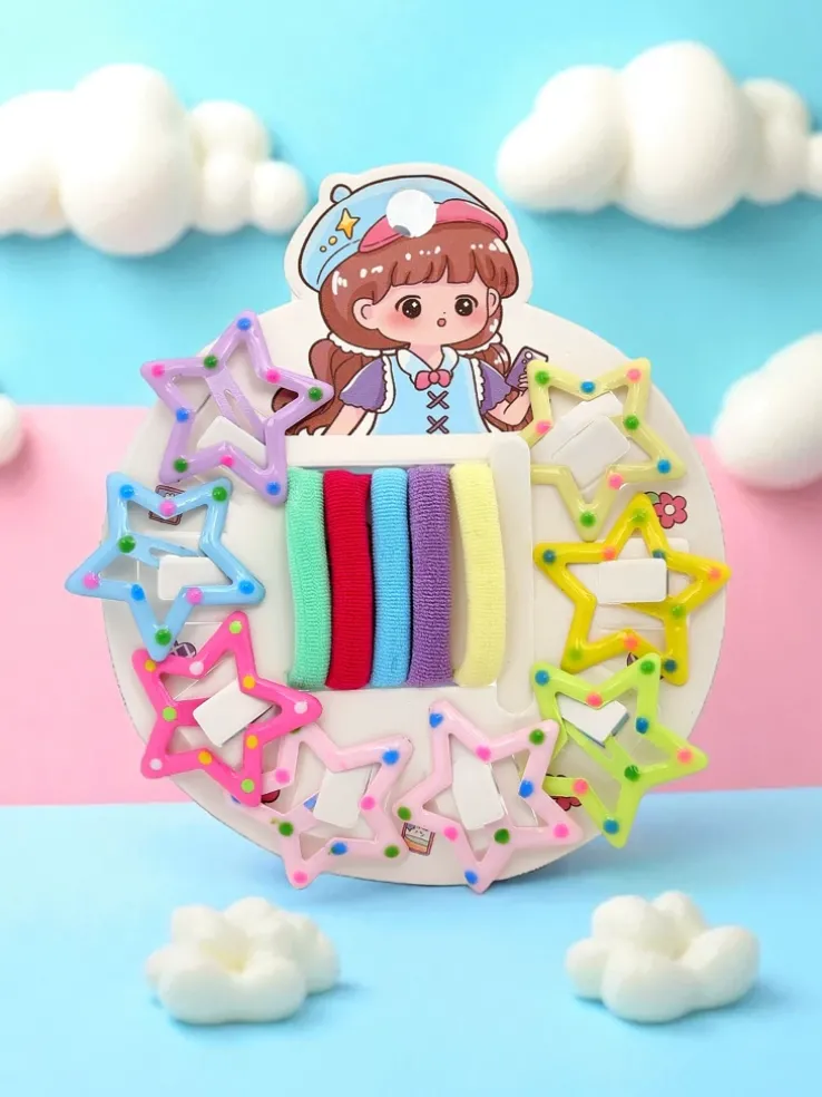 - Zestaw kolorowych spinek i gumek do włosów dla dzieci – akcesoria Stella Bambina, modne dodatki do każdej stylizacji.
