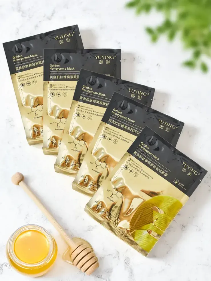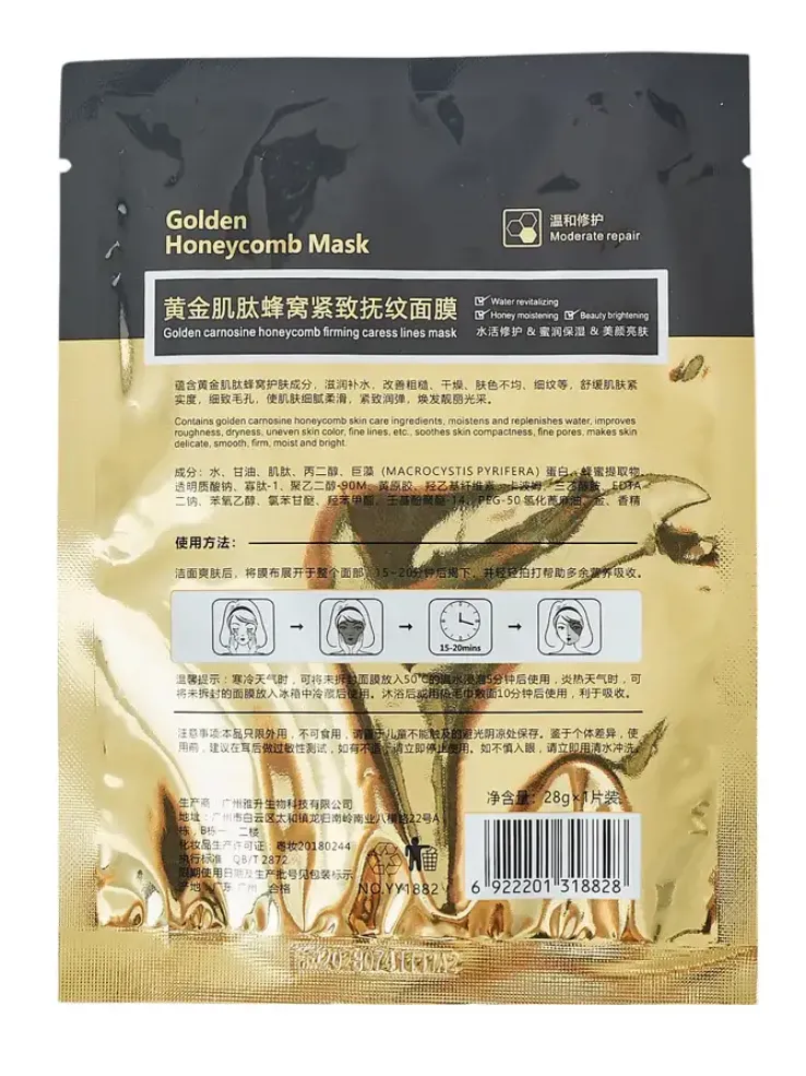 - Złota maseczka w płachcie o strukturze plastra miodu nawilża, odżywia i regeneruje skórę, pozostawiając ją gładką, promienną i pełną blasku.