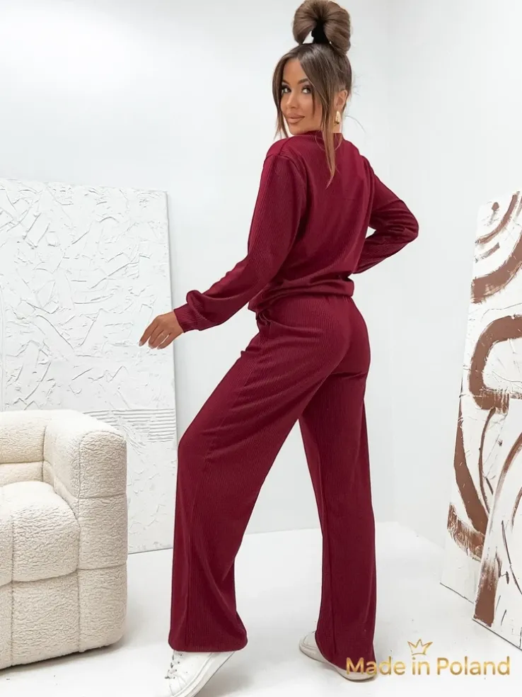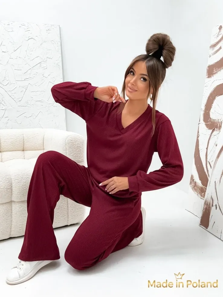 - Damski komplet sweterkowy- prążkowany, wykonany z przyjemnego materiału bawełnianego. Góra z dekoltem V. Długie, szerokie spodnie z gumą w pasie. Poczuj styl w tym wspaniałym komplecie!