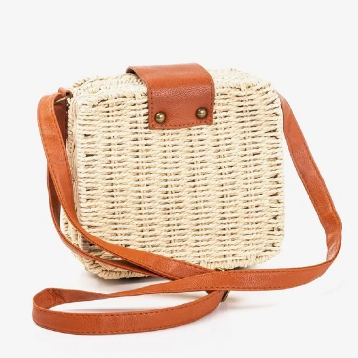 - Kwadratowa damska torebka typu kuferek wykonana z plecionej papierowej słomki w kolorze beżowym. Posiadają zamknięcie na klamrę. Podszewka tkaninowa.