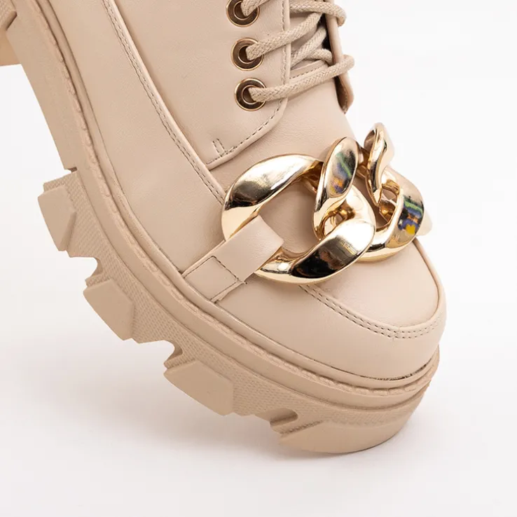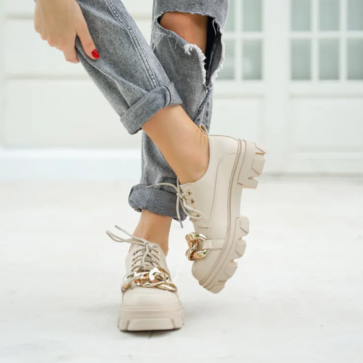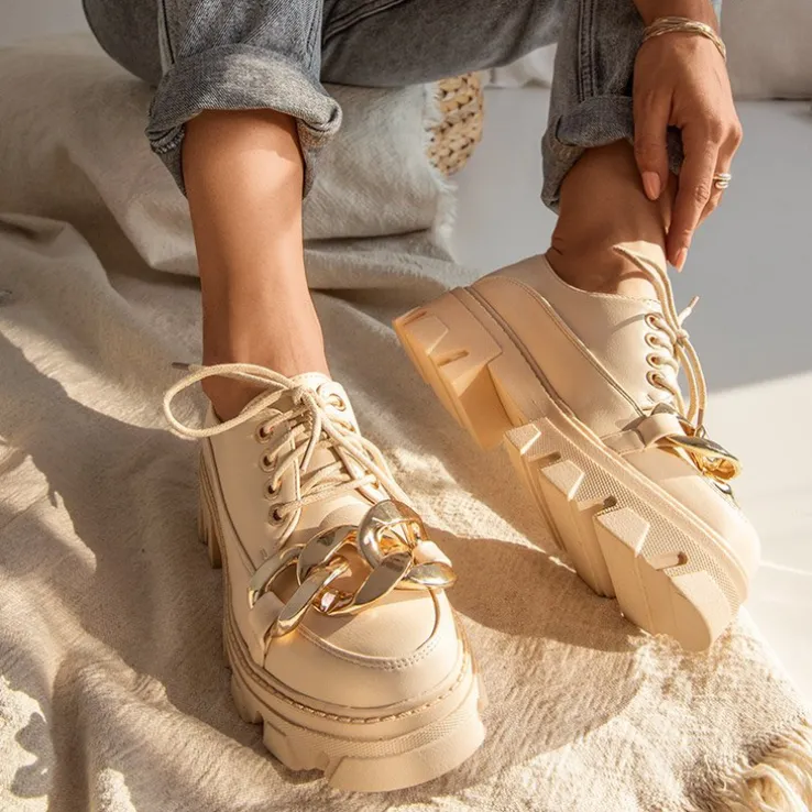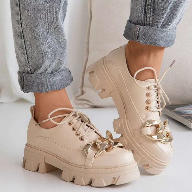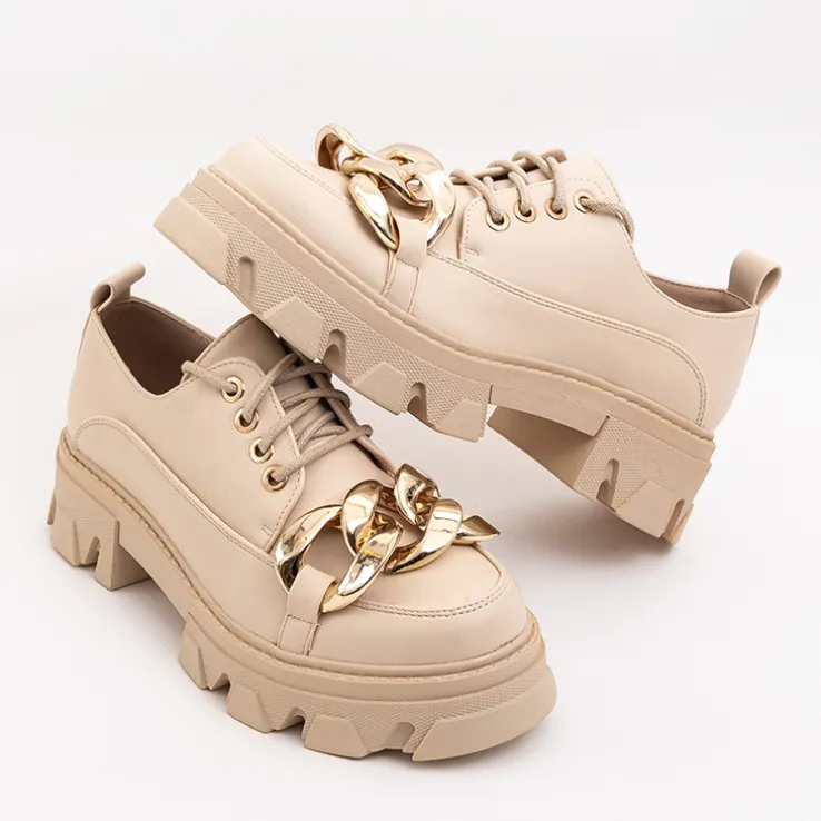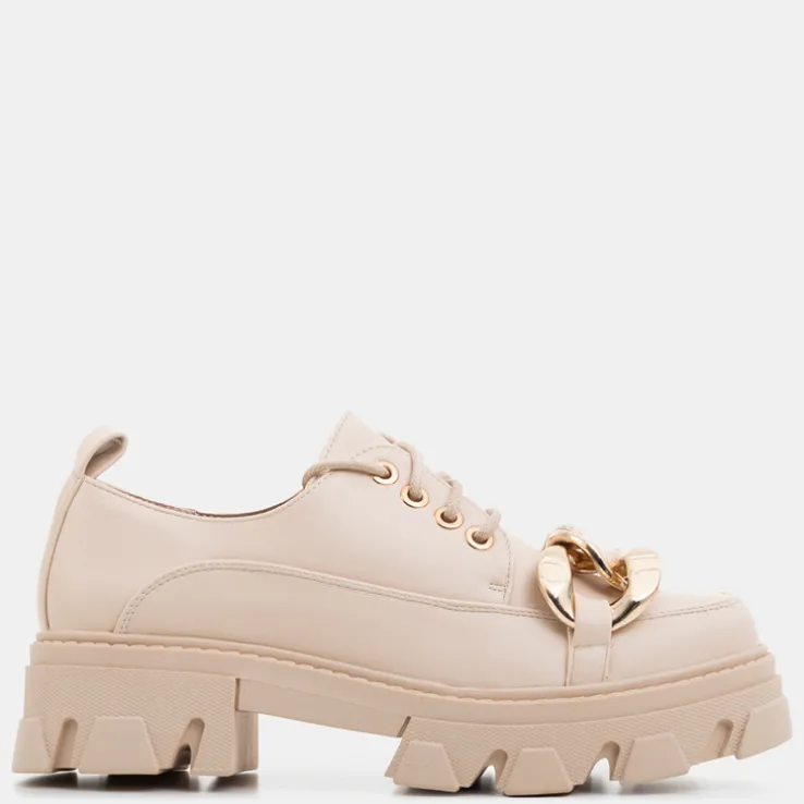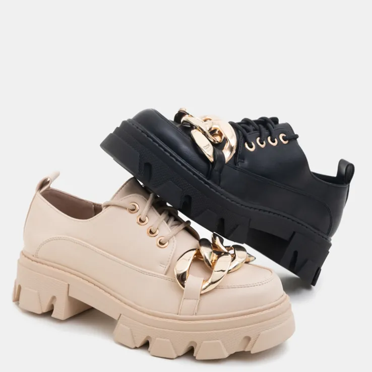 - Wyjątkowe półbuty damskie w stylu oxfordków, wykonane ze skóry ekologicznej. Cholewka sznurowana, zdobiona złotym elementem. Wkładka również z eko-skóry, podeszwa z tworzywa gumowego. Model jak najbardziej będzie się sprawdzał z eleganckimi stylizacjami!