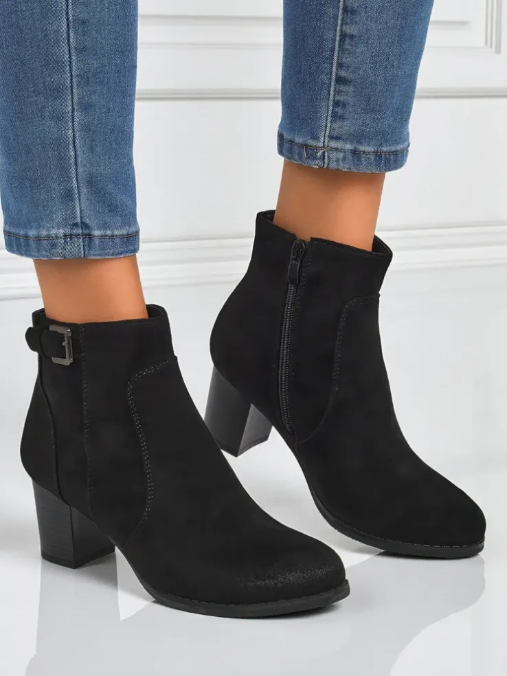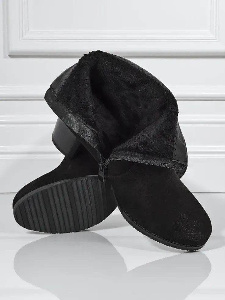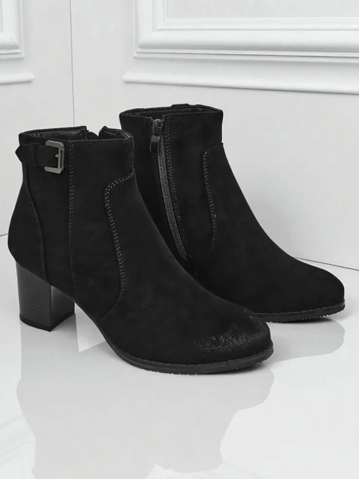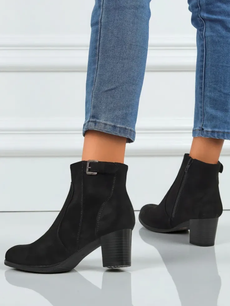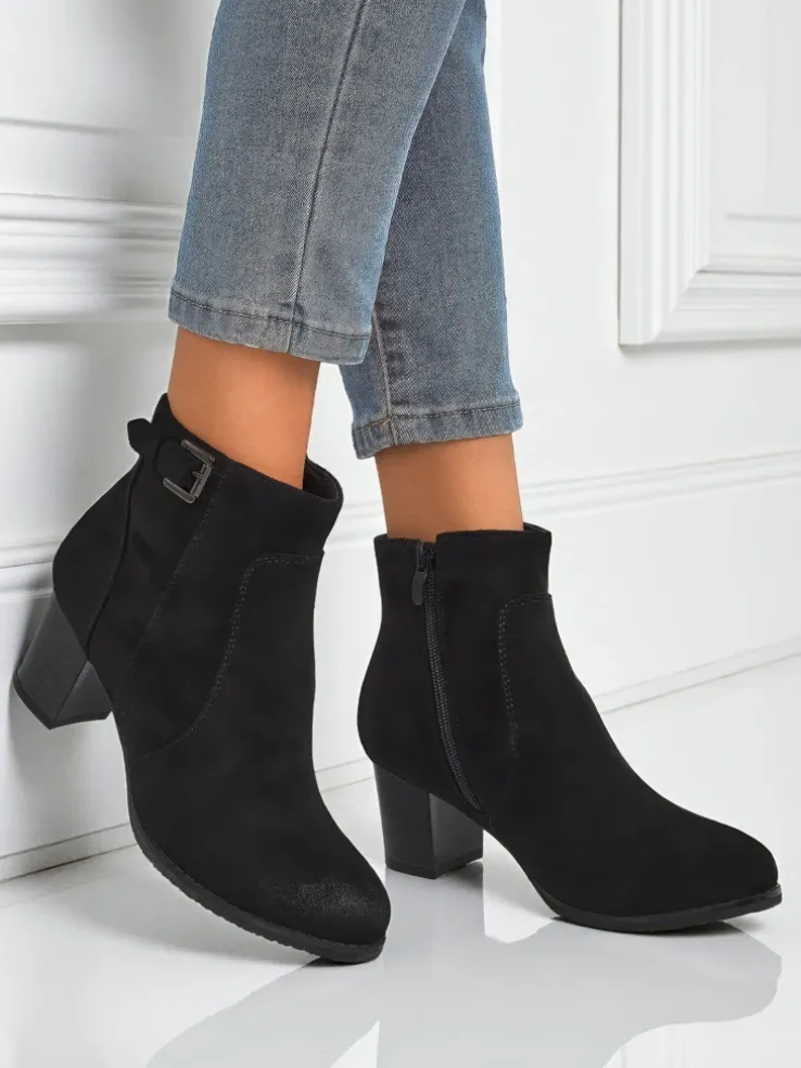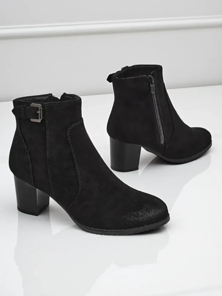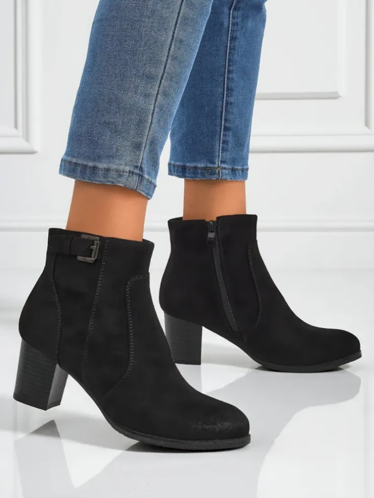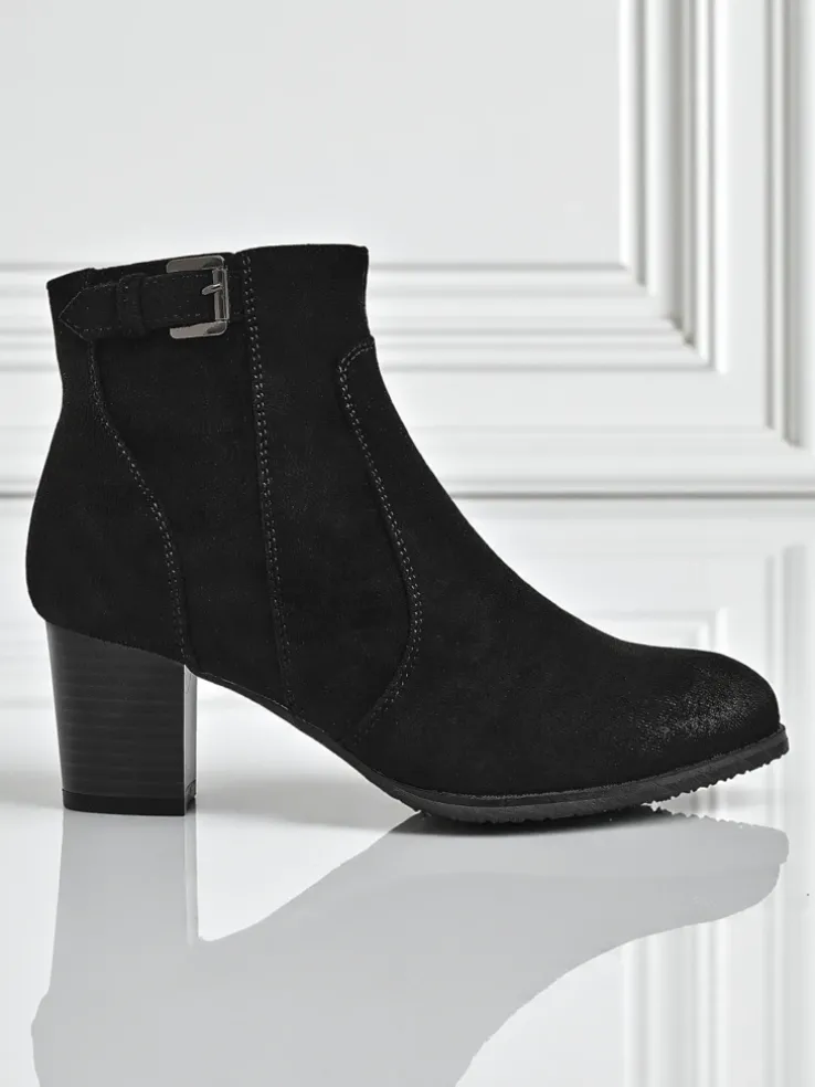 - Rewelacyjne botki damskie na obcasie, wykonane są z eko skóry zamszowej. Wnętrze wykonane z delikatnego futerka. Model zapinany na suwak. Posiadają ozdobne klamerki. Idealne do jesiennych kreacji!