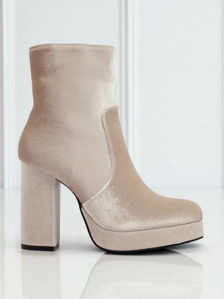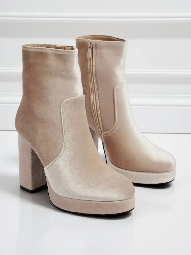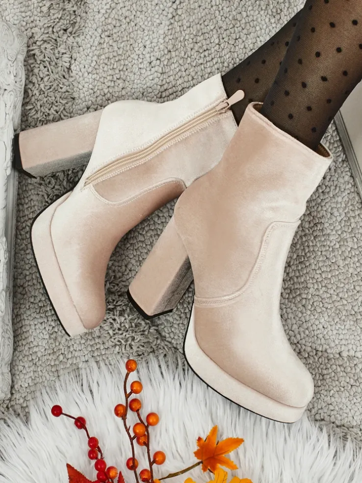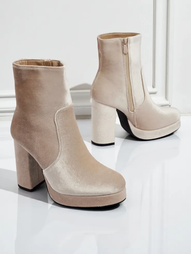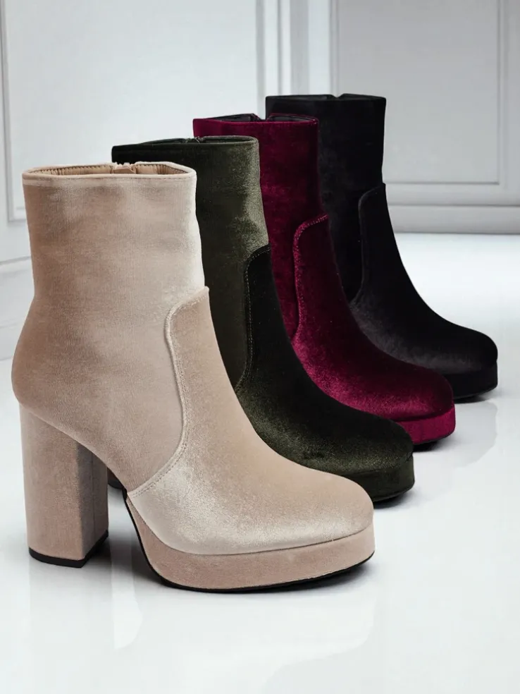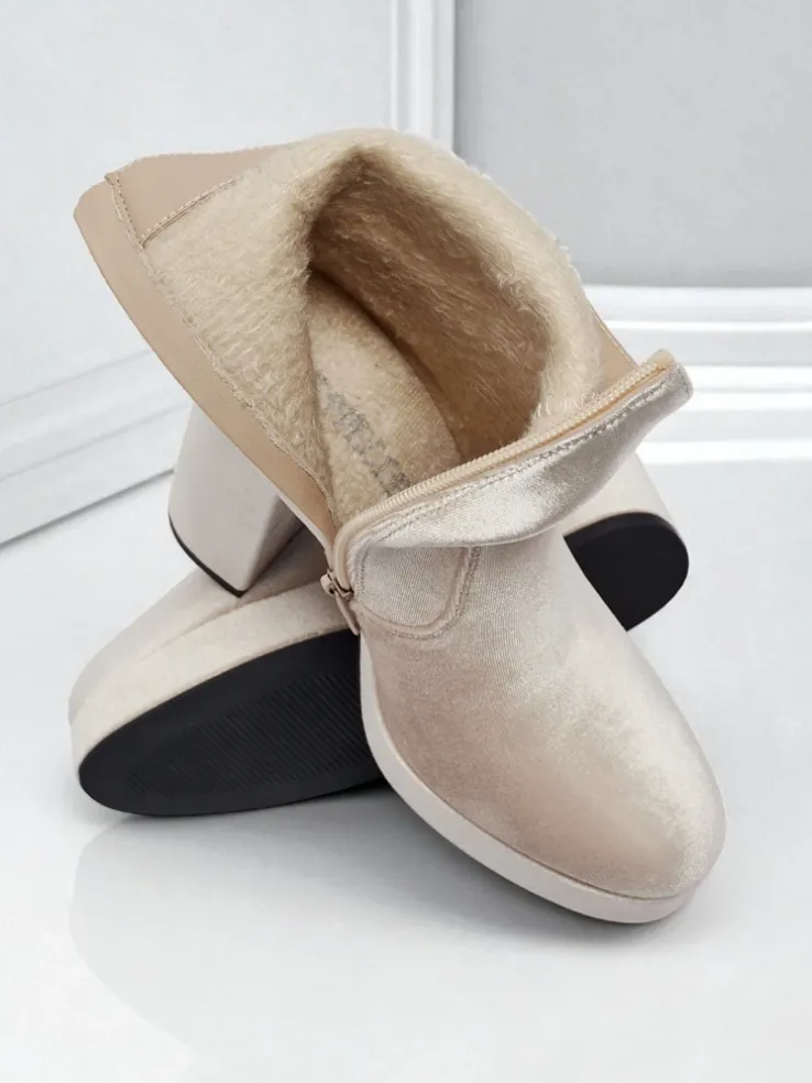 - Wygodne botki na słupku, wykonane z tkaniny a’la welurowej. Model zapinany na zamek. Posiada delikatne ocieplenie w formie futerka. Idealny wybór na jesień!