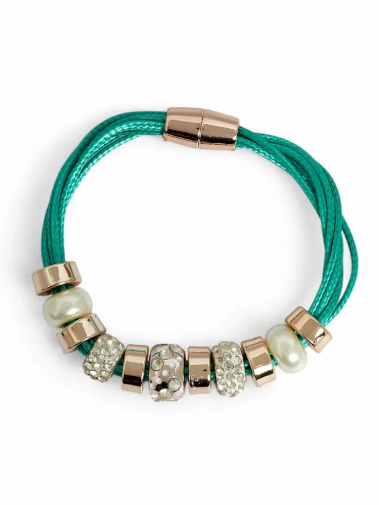 - Efektowna bransoletka damska na sznureczkach z magnetycznym zapięciem. Zdobiona srebrnymi koralikami z cyrkoniami, które pięknie połyskują w świetle. Stylowy dodatek do codziennych i wieczorowych stylizacji.