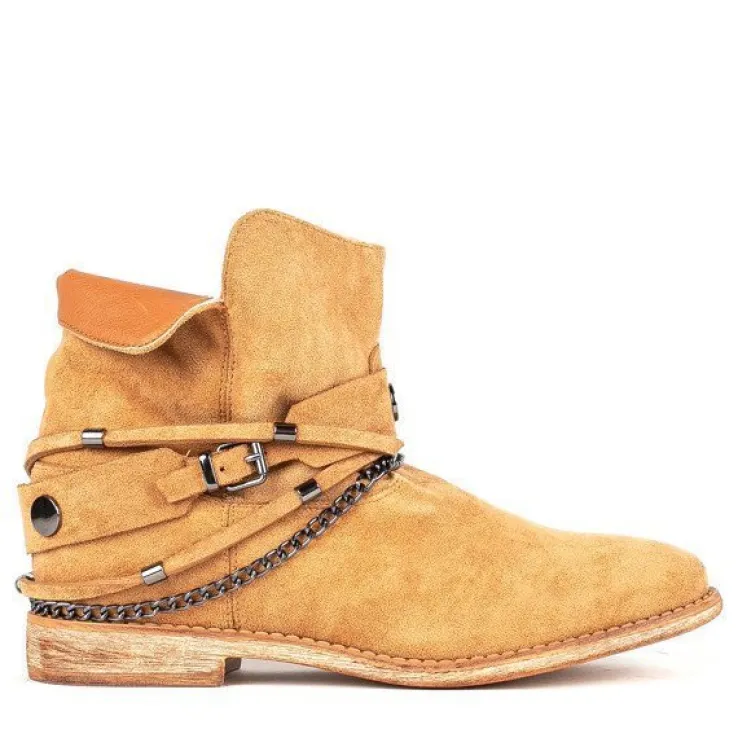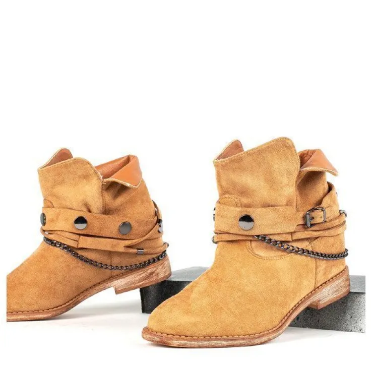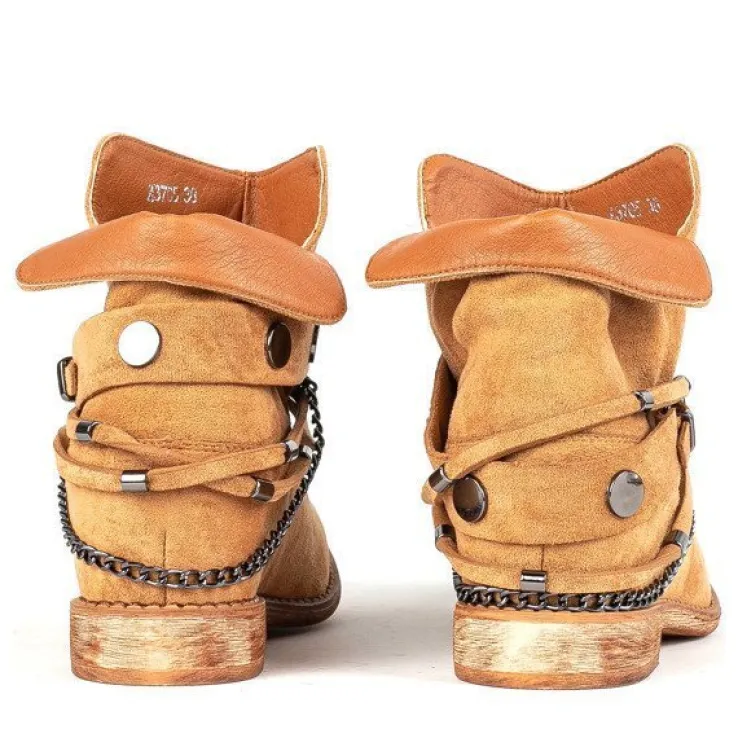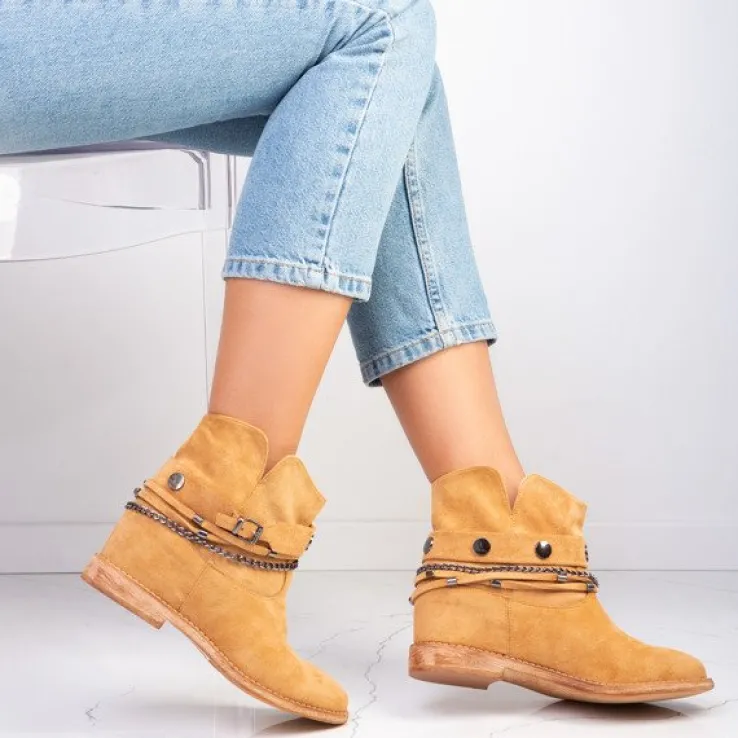 - Botki w stylu kowbojek na krytym koturnie. Materiał wykonania to eko-zamsz w brązowym kolorze. Środek buta jest ocieplony futerkiem. Obuwie posiada ozdoby, które można ściągnąć. Doskonałe do codziennej garderoby!
