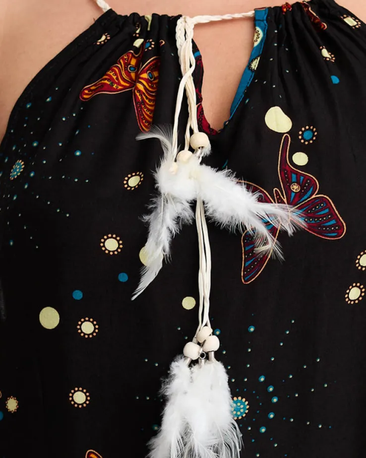- Oryginalna letnia damska sukienka do kolan w motylki, na ramiączkach. Model posiada rozkloszowany i dłuższy po bokach dół oraz wyjątkowe wiązanie przy okrągłym dekolcie w postaci sznureczka z piórkami. UWAGA: Dokładność pomiaru (+/-) 1 cm.
