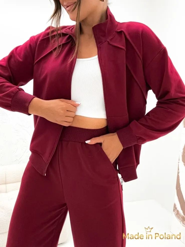 - Oryginalny damski komplet wykonany z przyjemnego materiału tkaninowego. Bluza z długimi rękawami bez kaptura, zapinana na zamek. Szerokie spodnie z gumą w pasie oraz 2 kieszeniami.