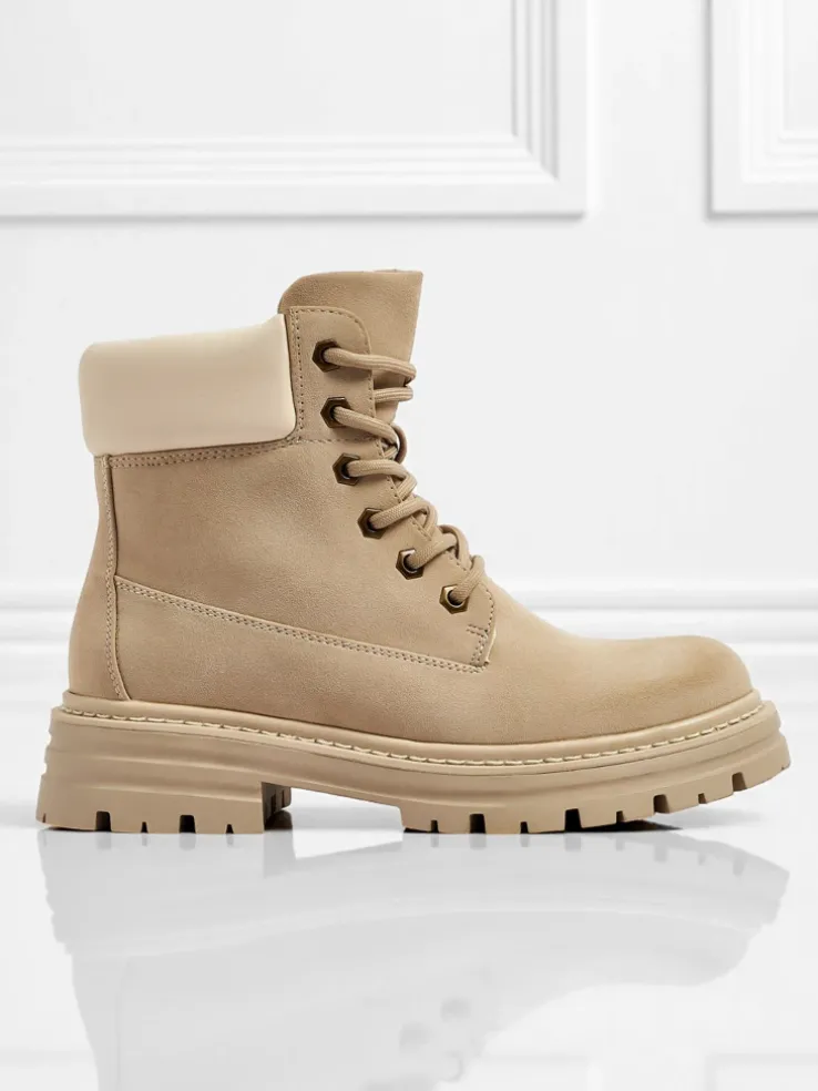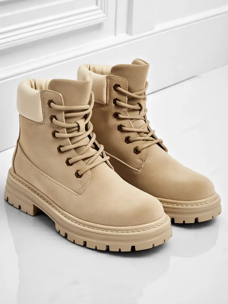 - Damskie trekkingowe trapery ze sznurowaną cholewką. Materiał wykonania to skóra ekologiczna. W środku wkładka ze skóry ekologicznej. Idealne na zimowy czas!