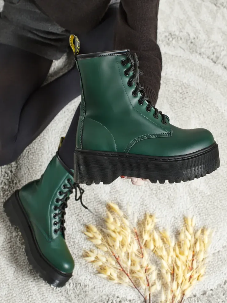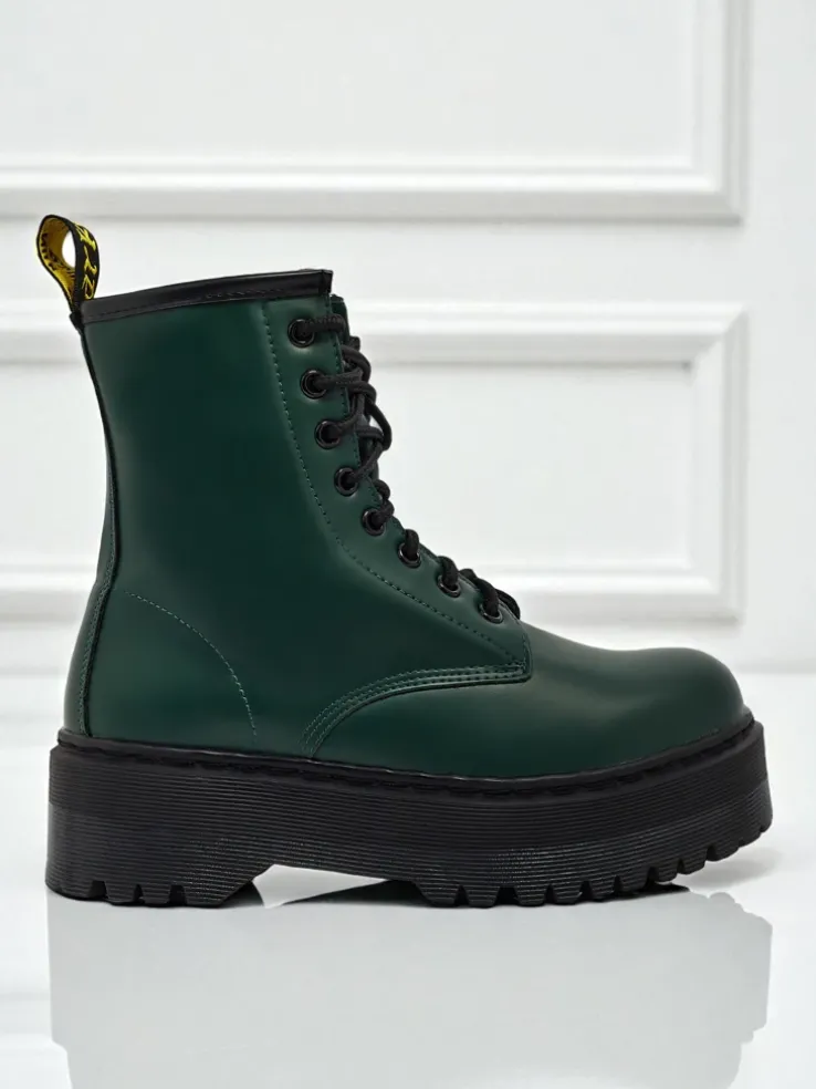 - Wysokie botki typu workery damskie z eko skóry, sznurowane. Model na platformie, w środku tkanina. Idealny wybór na chłodniejszy czas!