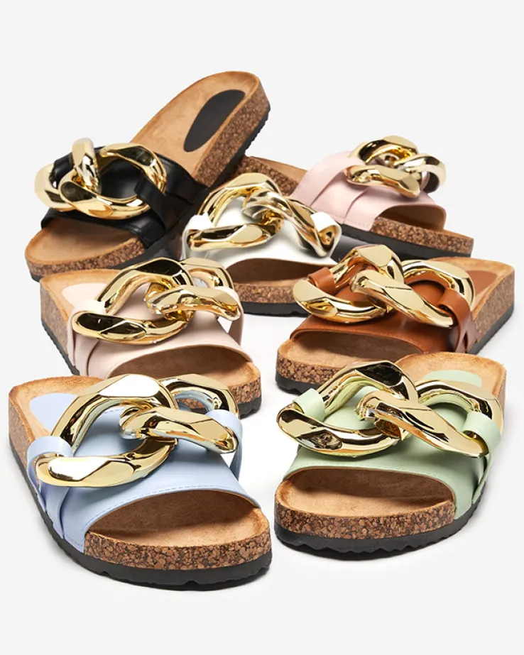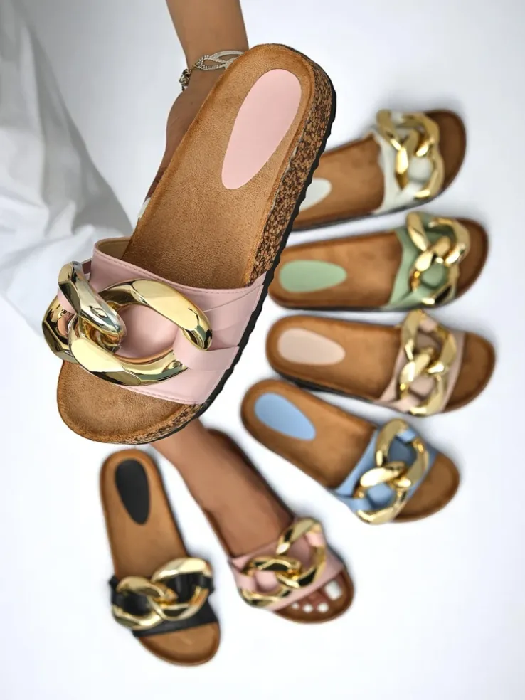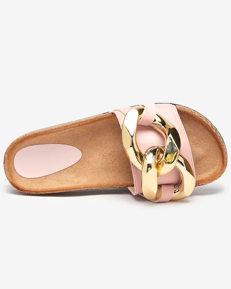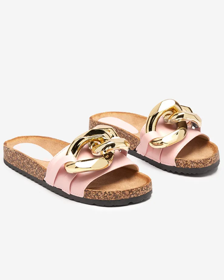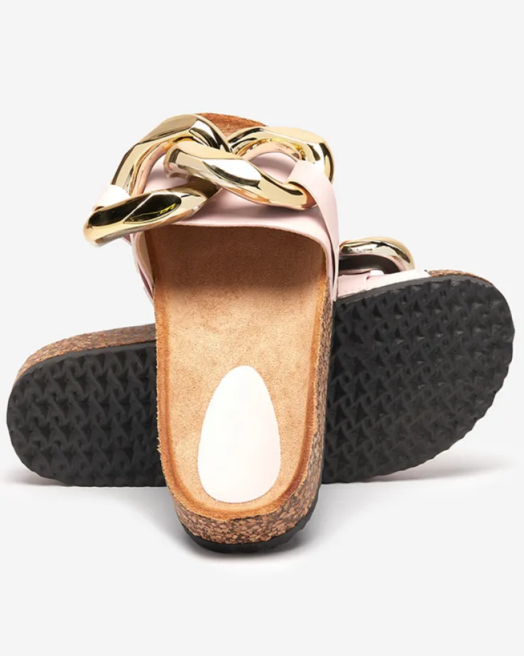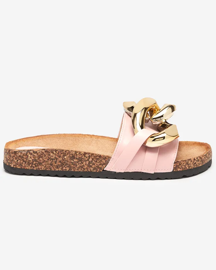- Stylowe klapki damskie wykonane ze skóry ekologicznej, wkładka zaś z eko skóry zamszowej. Posiadają złotą ozdobę na paseczku. Model na płaskiej i gumowej podeszwie z materiału a’la korek. Świetny dodatek do wielu letnich outfitów!