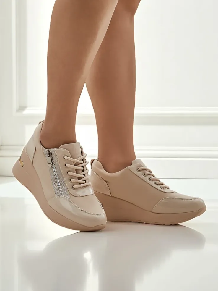 - Modne sneakersy damskie na koturnie, wykonane z eko skóry matowej i lakierowanej. W środku miękka, eko skórzana wkładka. Obuwie sznurowane. Będą świetną ozdobą do codziennych stylizacji.