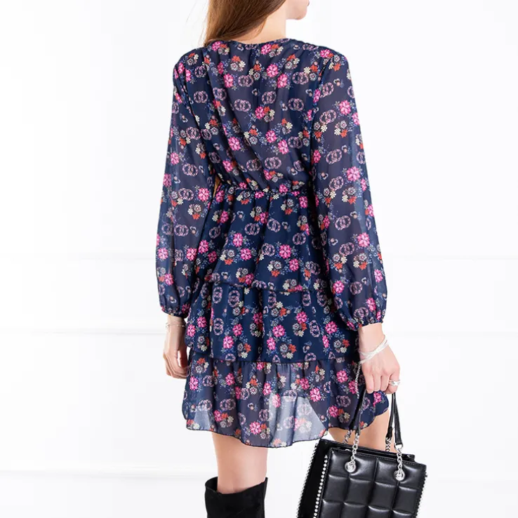 - Sukienka damska przed kolano, z długim rękawem oraz falbankami. Dekolt w serek oraz piękny i modny print w kwiaty. Super wybór na co dzień czy do pracy!
