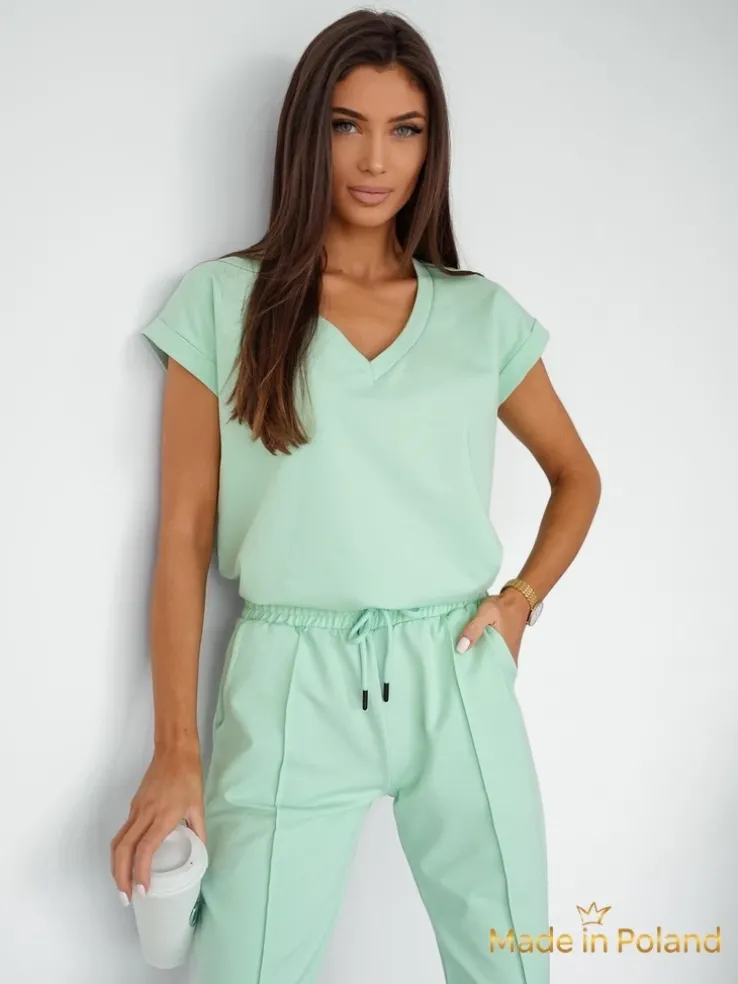 - Damski komplet casualowy wykonany z przyjemnej tkaniny. Bluza zakładana przez głowę, posiada krótkie rękawy oraz dekolt w serek. Zwężane spodnie z 2 wsuwanymi kieszeniami, gumą i troczkami w pasie. Idealny dla tych, którzy cenią komfort.