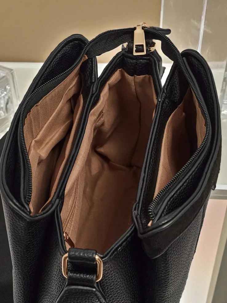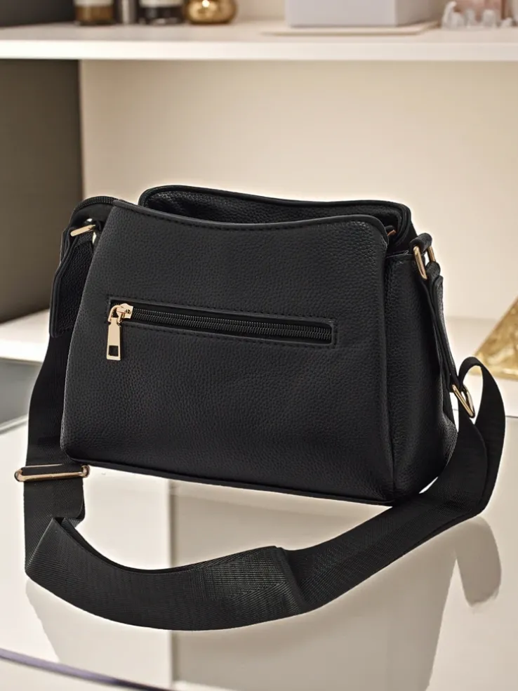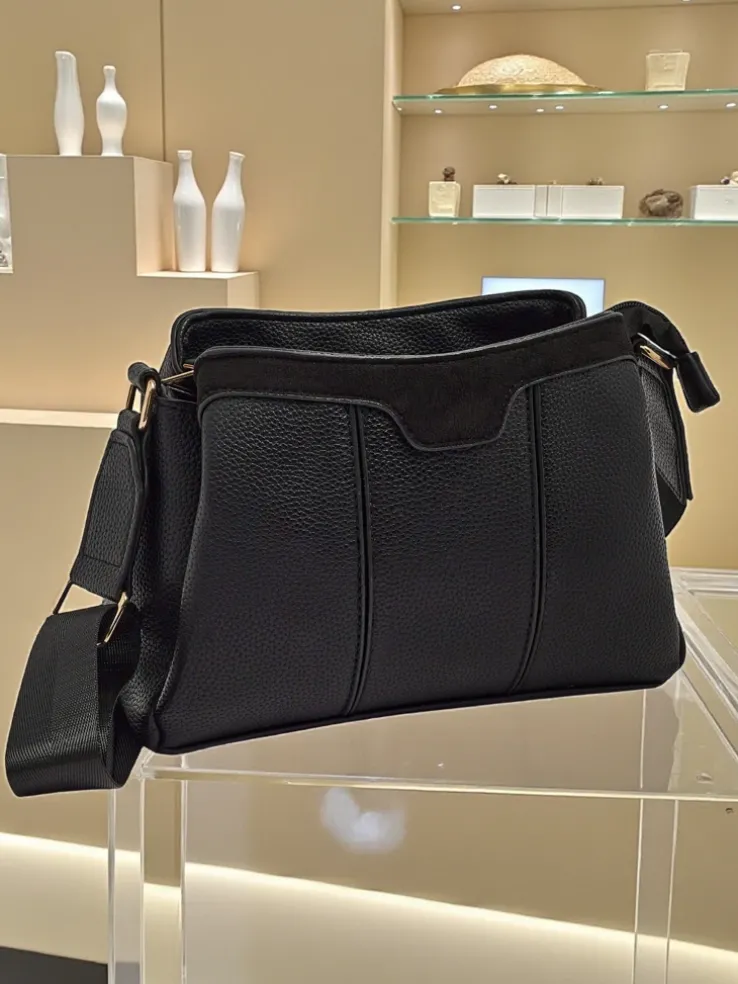 - Mała torebka wykonana z połączenia eko skóry i eko zamszu. 3 komory, 3 kieszonki, zamek oraz regulowany pasek. Styl i funkcjonalność w perfekcyjnym wydaniu.