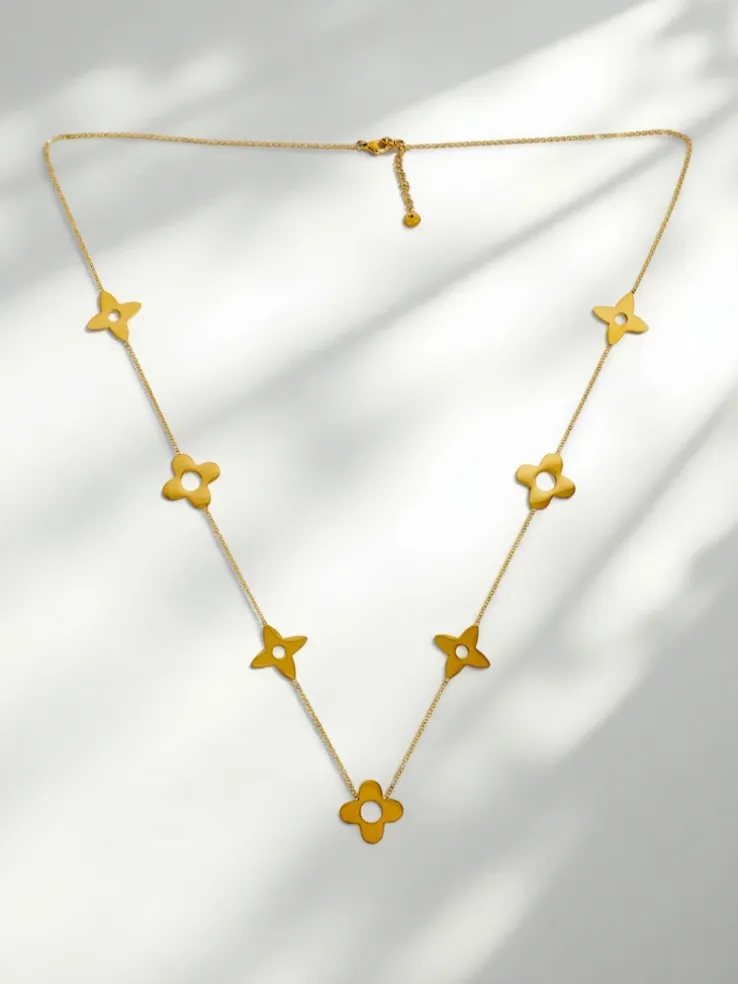 - Złocony naszyjnik z kwiatowymi zawieszkami – stylowa biżuteria na każdą okazję.