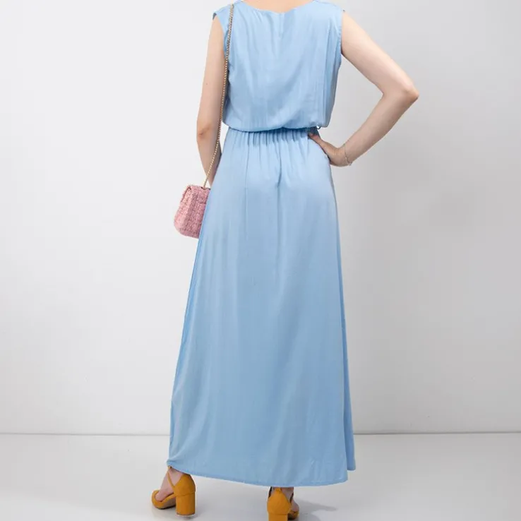 - Letnia damska sukienka maxi o lekko rozkloszowany kroju, wykonana z tkaniny poliestrowej. Model bez rękawów, z kopertowym dekoltem, w talii posiada elastyczną gumkę oraz materiałowy pasek. UWAGA: Dokładność pomiaru (+/-) 1 cm.