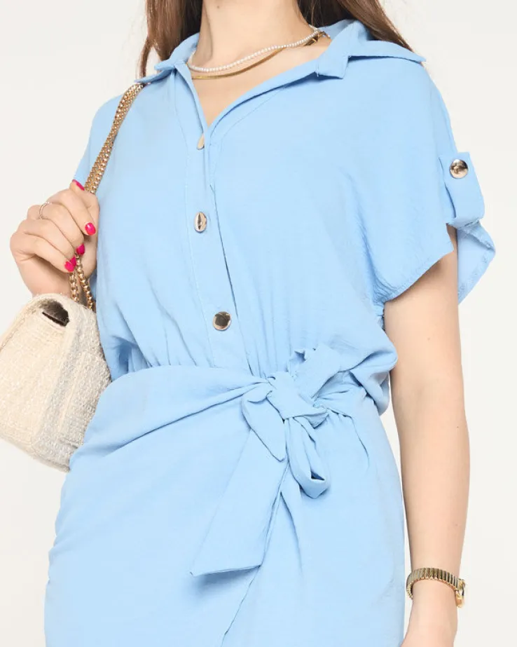 - Damska letnia sukienka mini, wykonana z lekkiej i zwiewniej tkaniny. Model zapinany guzikami, posiada kołnierzyk, gumę i ozdobne wiązanie w pasie. Świetnie sprawdzą się na ciepłe, letnie dni!