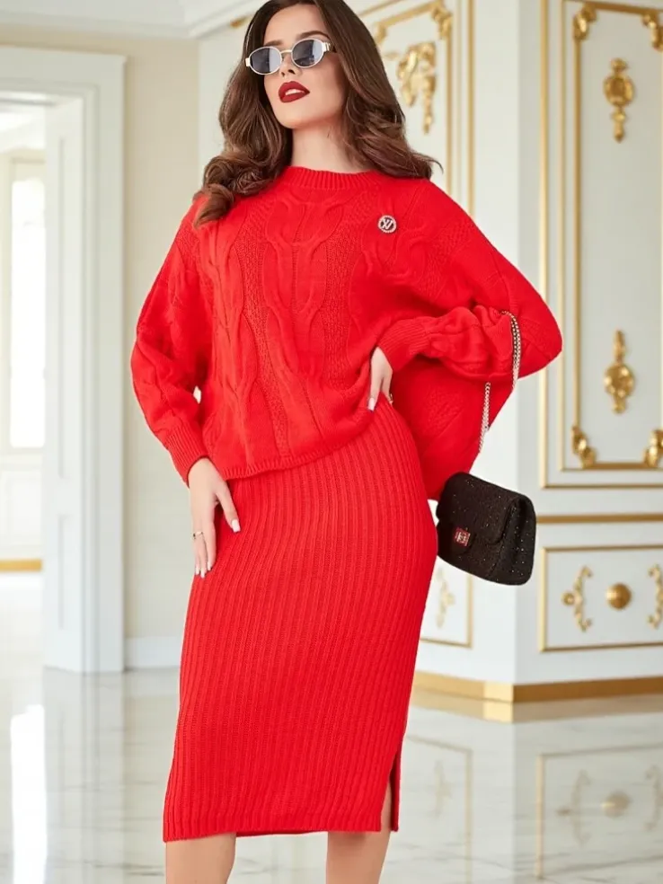 - Damski komplet wykonany z przyjemnej tkaniny. Sweterek z długimi rękawami i okrągłym dekoltem oraz spódnica midi, wyposażona w gumę w talii. Idealna stylizacja na zimę! UWAGA: Dokładność pomiaru (+/-) 1 cm.