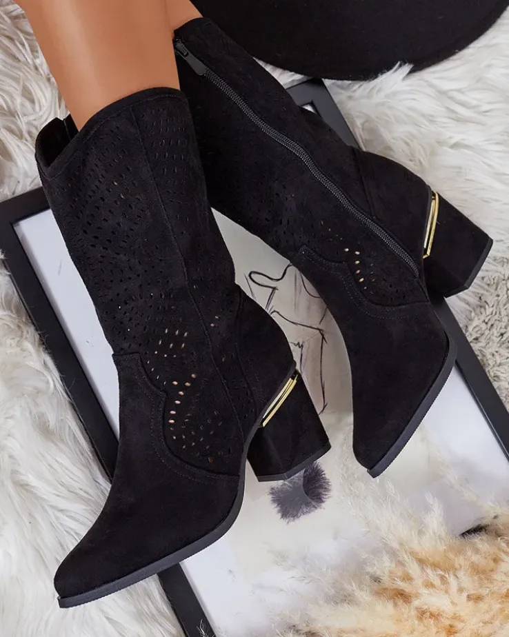 - Botki a’la kowbojki do połowy łydki na słupku, wykonane ze skóry ekologicznej zamszowej z ażurowym wykończeniem. Wkładka jest wykonana z eko skóry, buty na suwak. Pasują do wielu kobiecych stylizacji!
