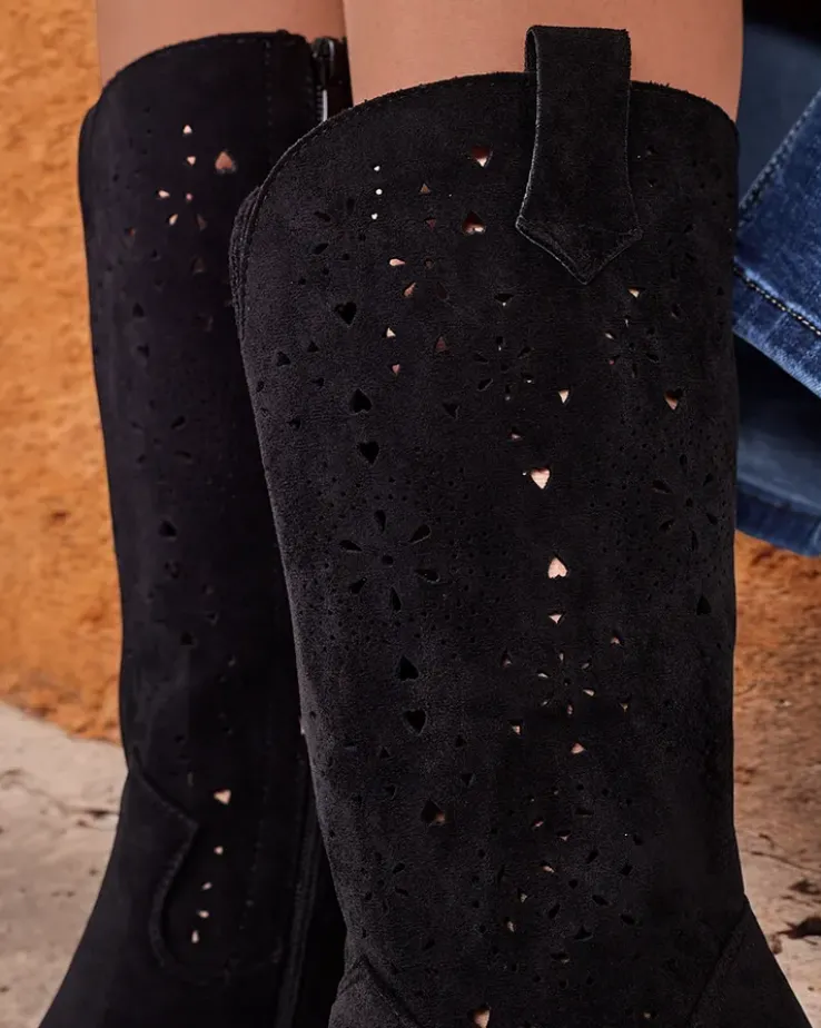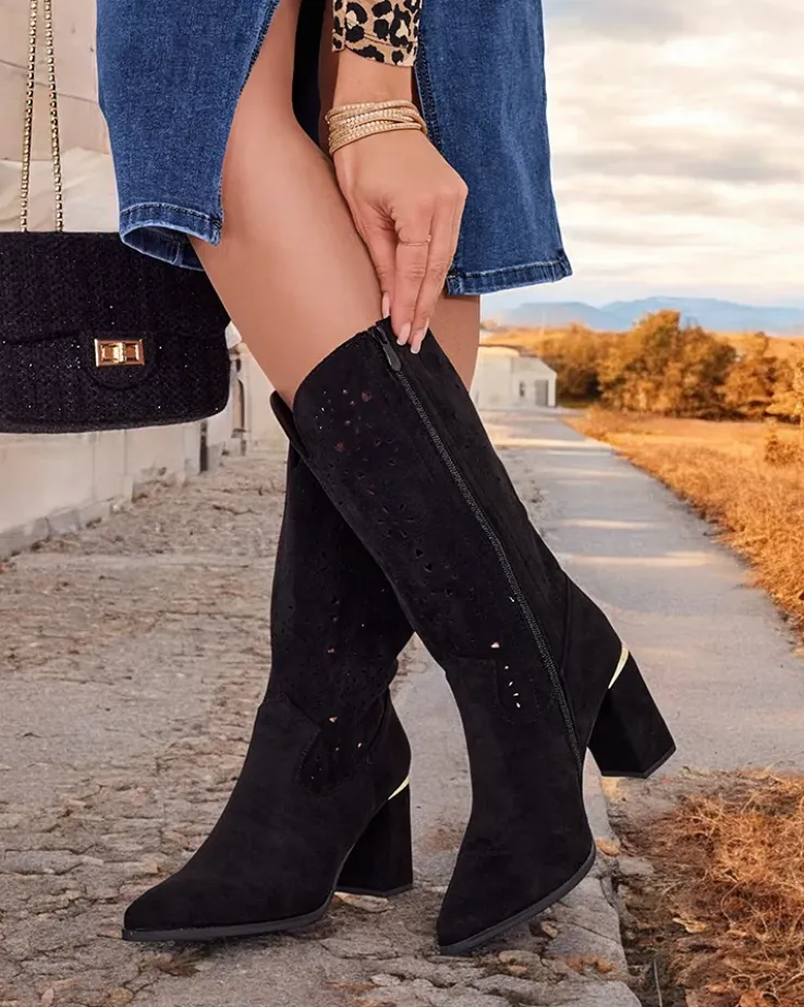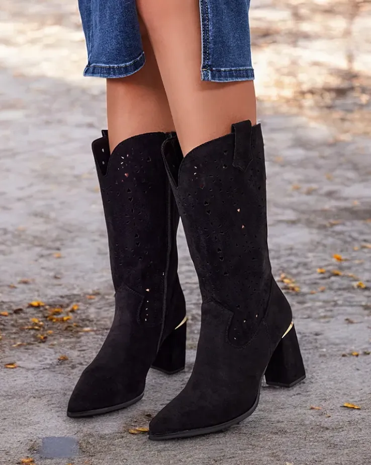 - Botki na słupku, wykonane ze skóry ekologicznej zamszowej z ażurowym wykończeniem. Wkładka eko skórzana, buty na suwak. Pasują do wielu kobiecych stylizacji!